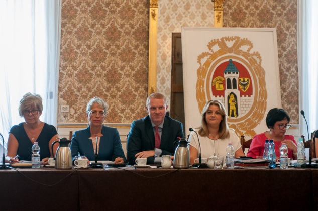 Burmistrz Daniel Marchewka ze skarbnikiem Teresą Łapczyńską i Wandą Winczaruk, przewodniczącą Rady Miasta Żagań.