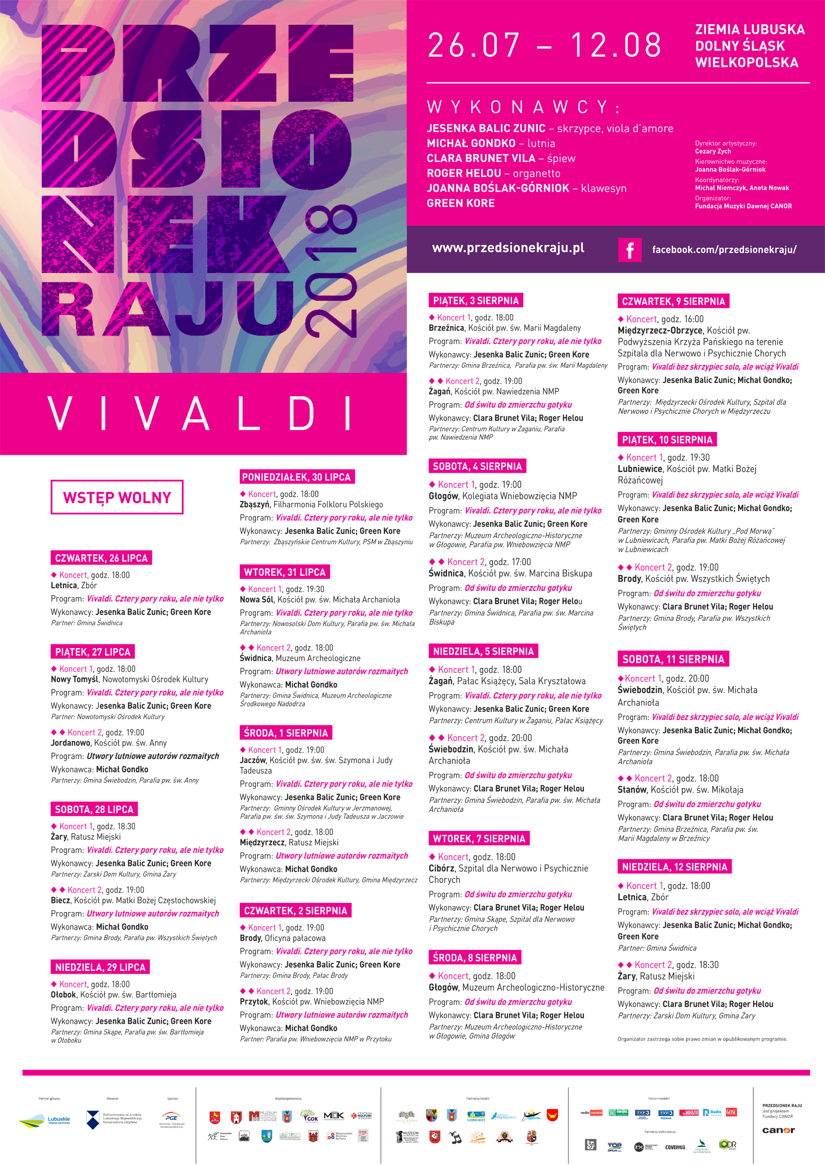 Czwartek, 9 sierpnia. Koncert, godz. 16.00. Międzyrzecz-Obrzyce, Kościół pw. Podwyższenia Krzyża Pańskiego na terenie Szpitala dla Nerwowo i Psychicznie Chorych. Wykonawcy: Jesenka Balic Zunic – viola d’amore; Michał Gondko – lutnia; Green Kore. Program: Vivaldi bez skrzypiec solo, ale wciąż Vivaldi.