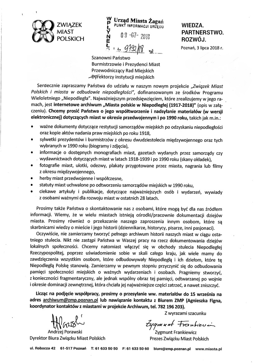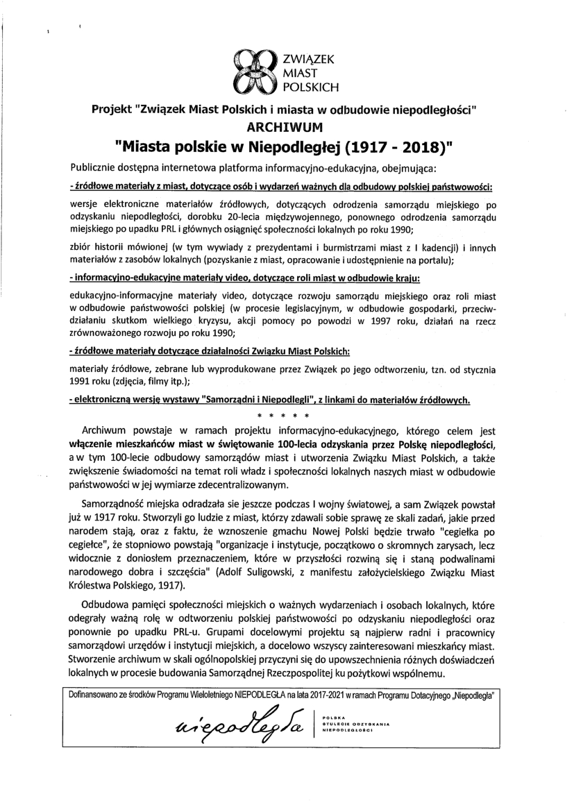 Związek Miast Polskich zaprasza do udziału w projekcie „Związek Miast Polskich i miasta w odbudowie niepodległości”, dofinansowanym z programu „Niepodległa”.