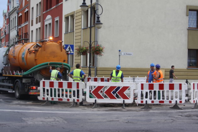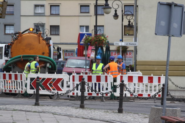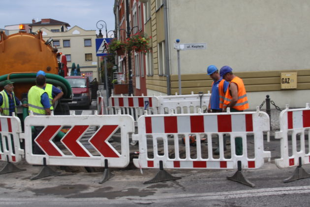 W czwartek 23 sierpnia wieczorem pękła stara, żeliwna rura wodociągowa o dużej średnicy, u zbiegu Rynku i ul. Keplera. Wyciek wody spowodował zapadnięcie się fragmentu jezdni.