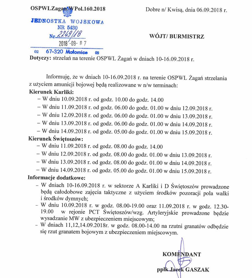Komenda poligonu informuje o ćwiczeniach wojskowych, które odbywają się na żagańsko-świętoszowskich poligonach do niedzieli 16 września. Przypominamy, że obowiązuje zakaz wstępu na poligon.