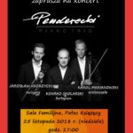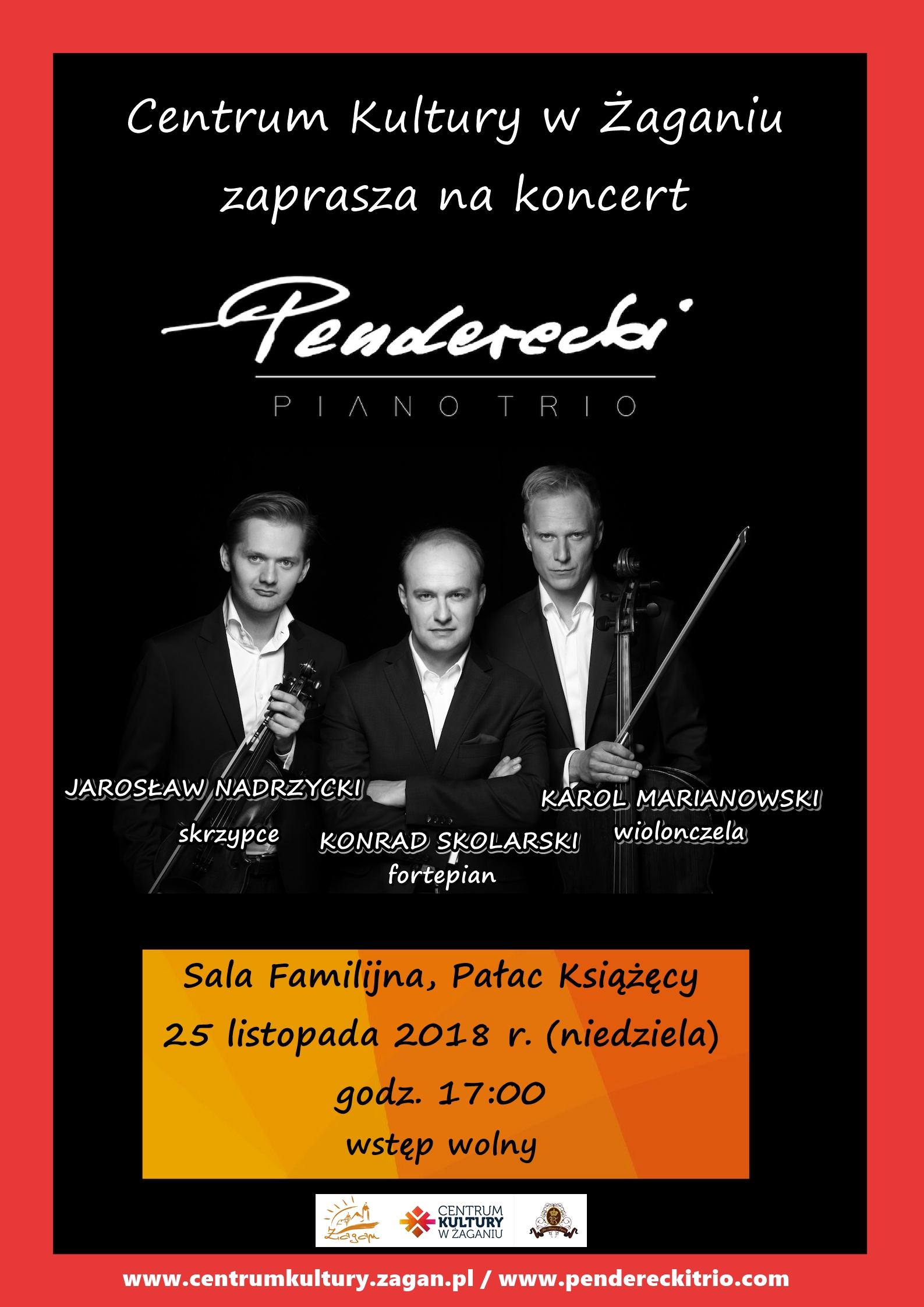 W niedzielę 25 listopada o godz. 18.00 Centrum Kultury zaprasza do sali Familijnej Pałacu Książęcego na wyjątkowy koncert wirtuozów, czyli Penderecki Piano Trio w składzie: Jarosław Nadrzycki – skrzypce, Konrad Skolarski – fortepian i Karol Marianowski – wiolonczela. Wstęp wolny.