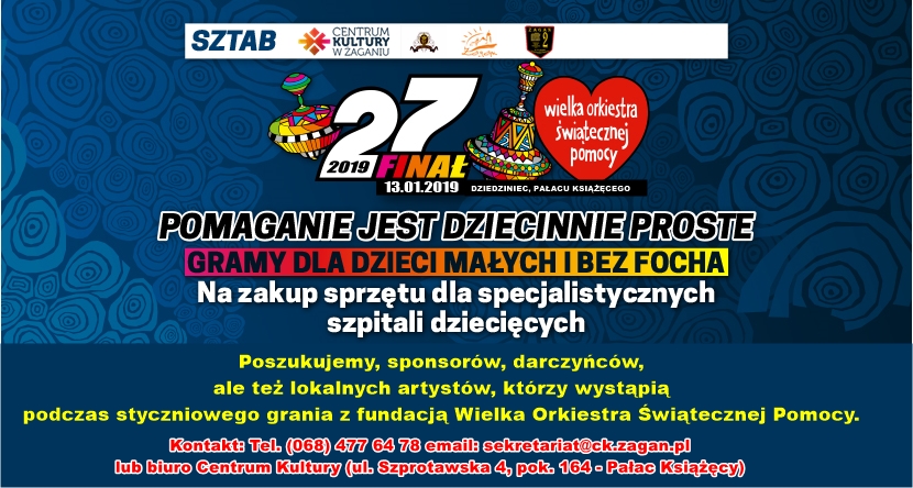 Wielka Orkiestra Świątecznej Pomocy zagra już 13 stycznia 2019 roku na dziedzińcu pałacu. Kontakt do sztabu WOŚP: tel. 68 477 64 78, email: sekretariat@ck.zagan.pl, biuro Centrum Kultury ul. Szprotawska 4, pok. 164 – Pałac Książęcy.