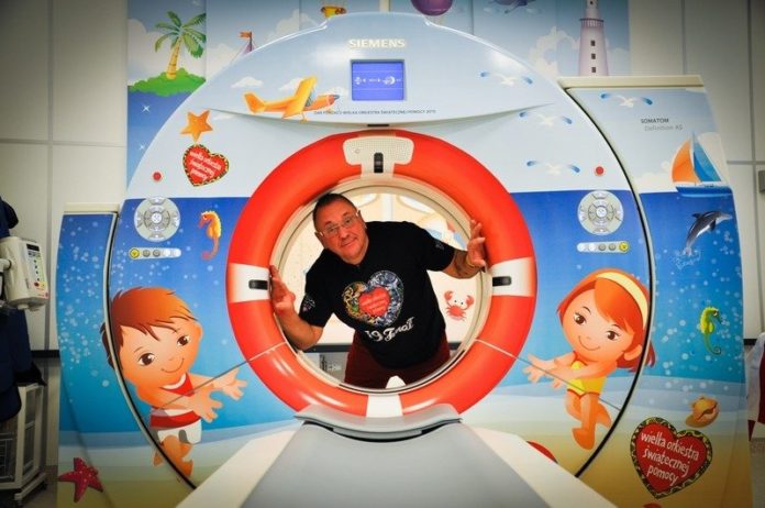 Za zdjęciu czołówkowym Jurek Owsiak przy tomografie komputerowym zakupionym przez WOŚP.