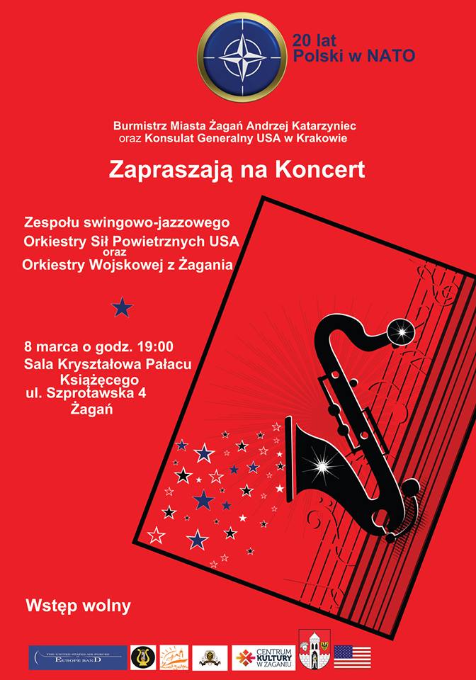8 marca o godzinie 19.00 rozpocznie się wyjątkowe wydarzenie, do udziału w którym serdecznie zapraszamy. W Sali Kryształowej Pałacu Książęcego przy ul. Szprotawskiej 4 w Żaganiu na jednej scenie wystąpią dwie orkiestry wojskowe – Zespół Swingowo-Jazzowy Orkiestry Sił Powietrznych USA  „Ambassadors” oraz Orkiestra Wojskowa z Żagania. Na to niezwykłe wydarzenie zapraszamy wspólnie z Konsulatem Generalnym USA w Krakowie oraz 11 Lubuską Dywizją Kawalerii Pancernej. Koncert wpisuje się w całotygodniowe obchody 20-tej rocznicy wstąpienia Polski do NATO, stanowiąc wyjątkowe na mapie kraju wydarzenie muzyczne.
