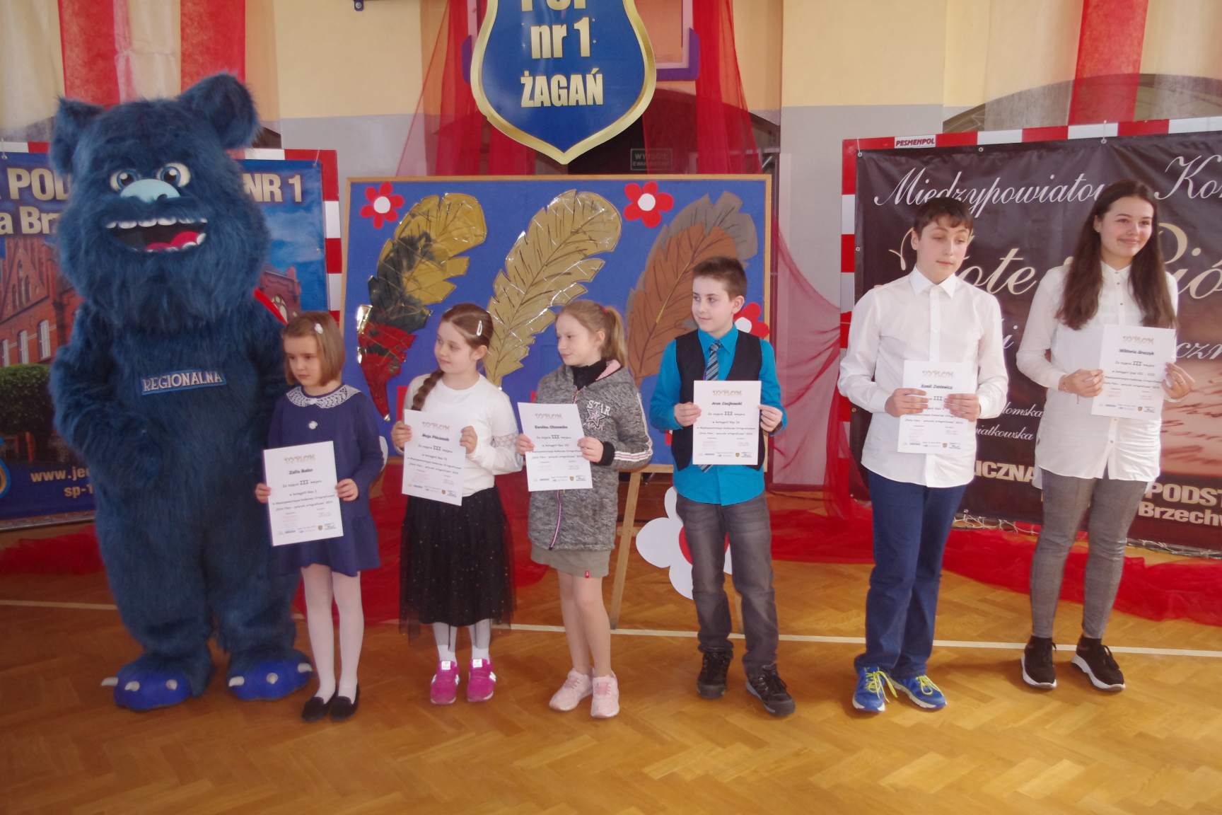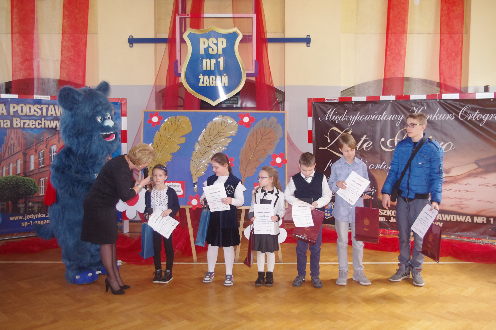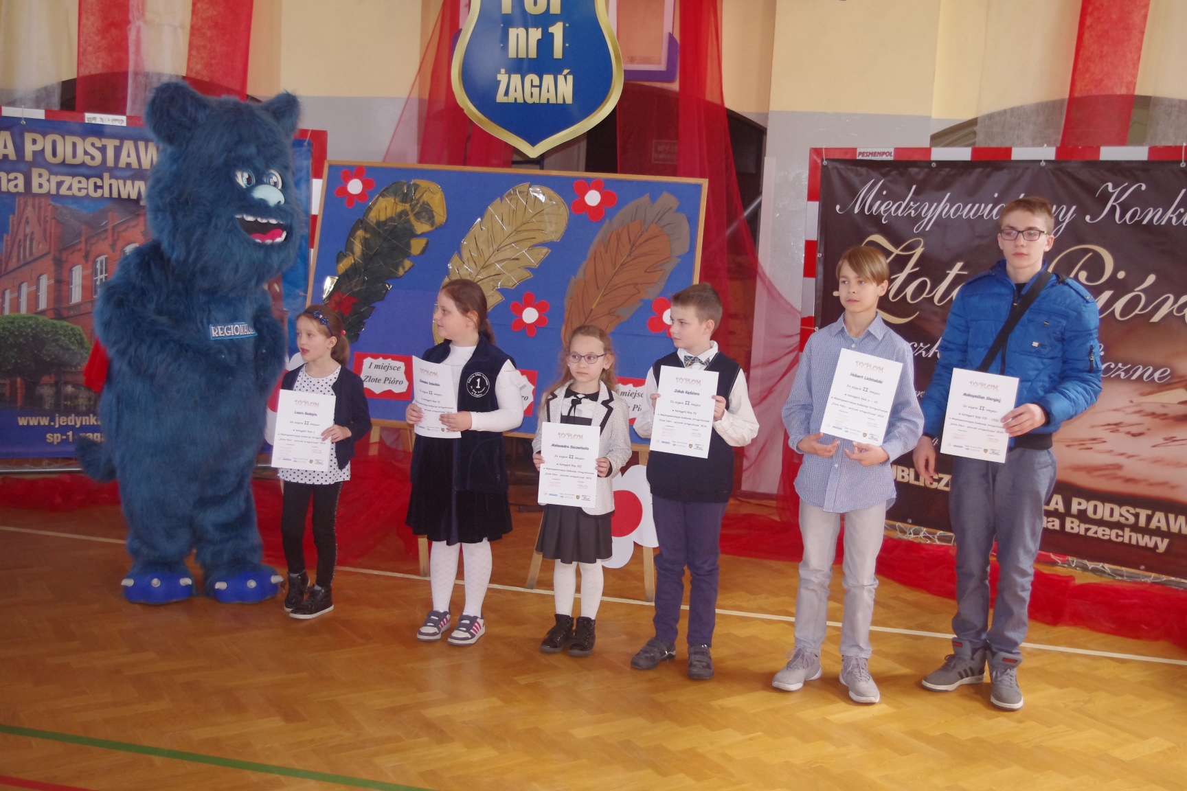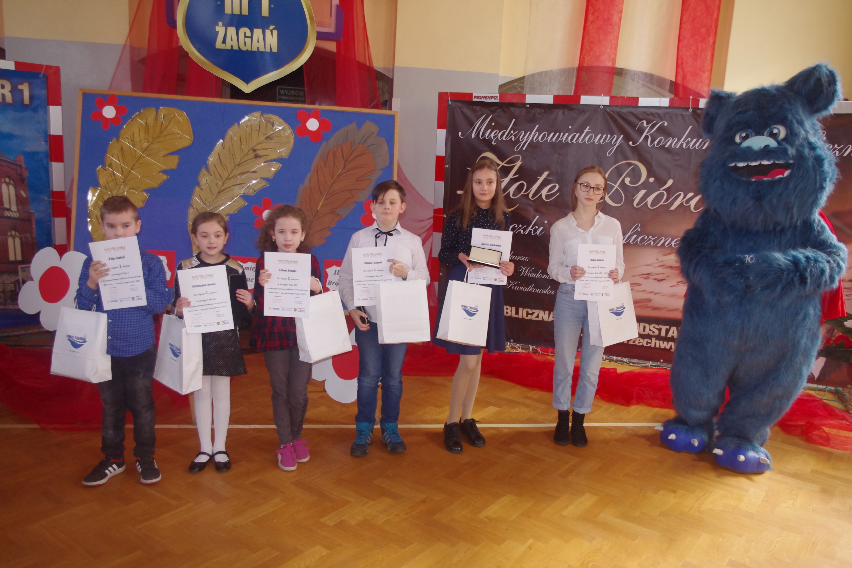 Każdy uczestnik otrzymał pamiątkowy dyplom i długopis z logo konkursu, a laureaci złote, srebrne i brązowe pióra. Konkurs zakończył się uroczystą galą na sali gimnastycznej PSP1 w Żaganiu. W obecności gości, rodziców, nauczycieli i uczniów wręczono nagrody ufundowane przez Burmistrza Miasta Żagań oraz Starostwo Powiatowe w Żaganiu.