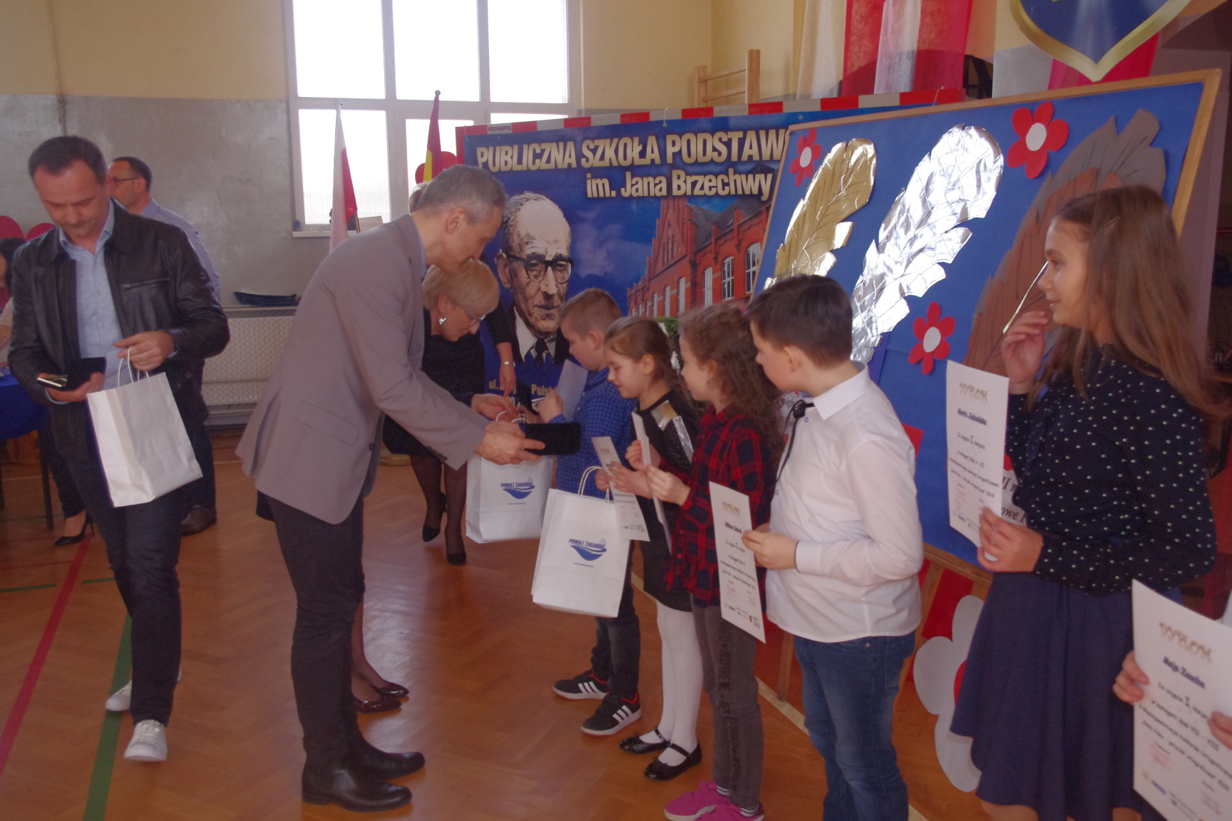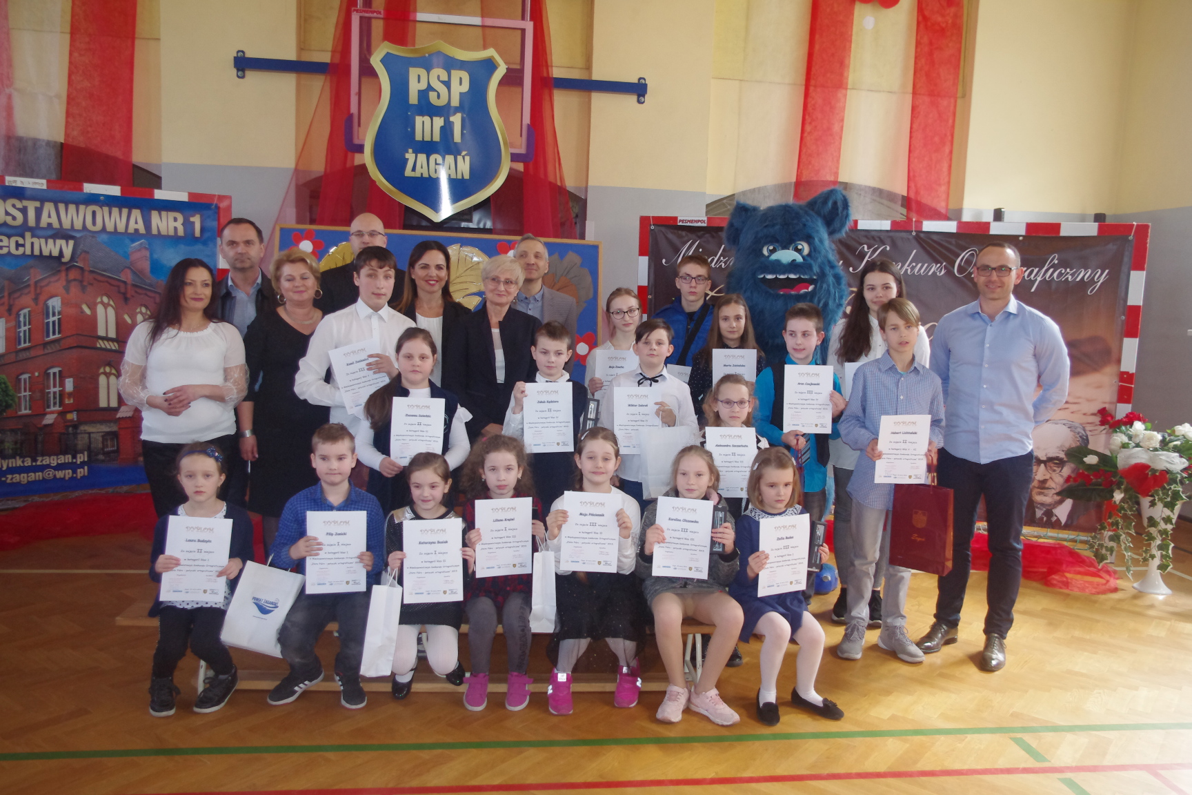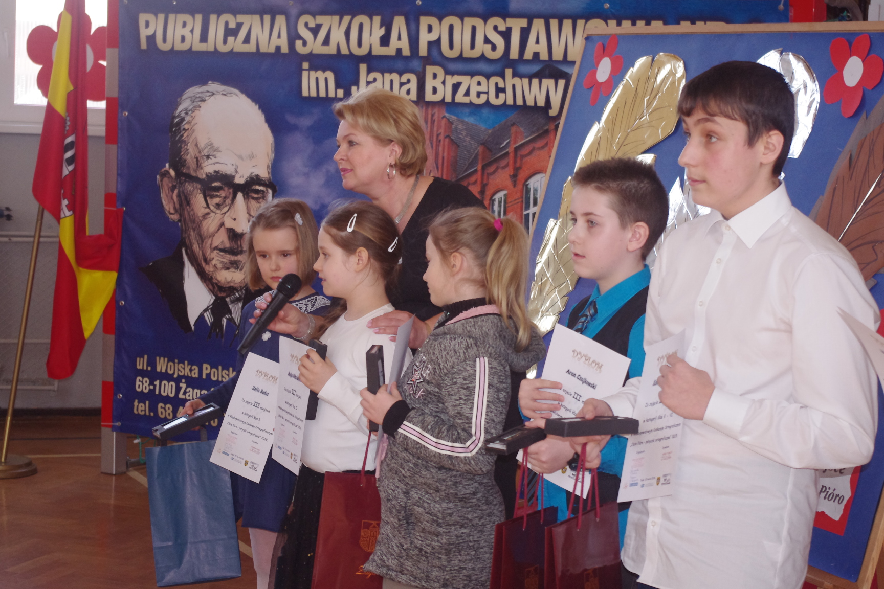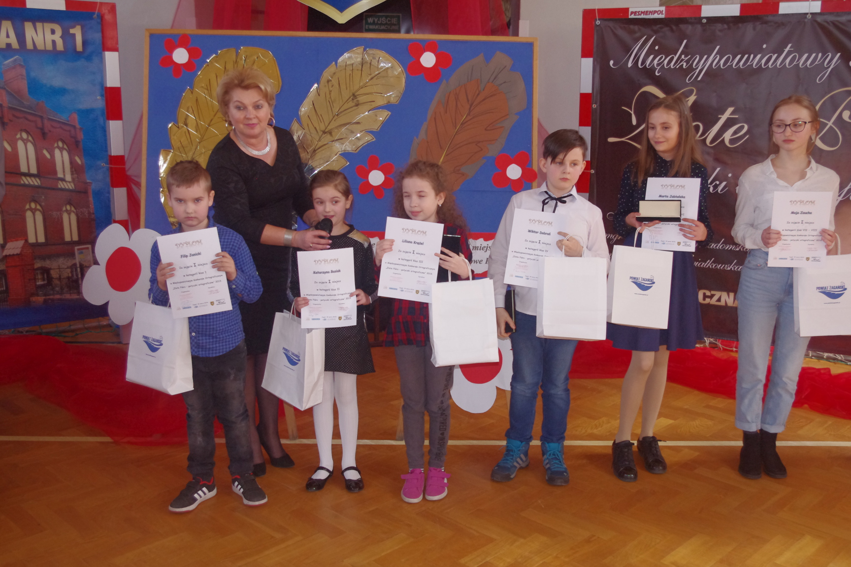 Każdy uczestnik otrzymał pamiątkowy dyplom i długopis z logo konkursu, a laureaci złote, srebrne i brązowe pióra. Konkurs zakończył się uroczystą galą na sali gimnastycznej PSP1 w Żaganiu. W obecności gości, rodziców, nauczycieli i uczniów wręczono nagrody ufundowane przez Burmistrza Miasta Żagań oraz Starostwo Powiatowe w Żaganiu.