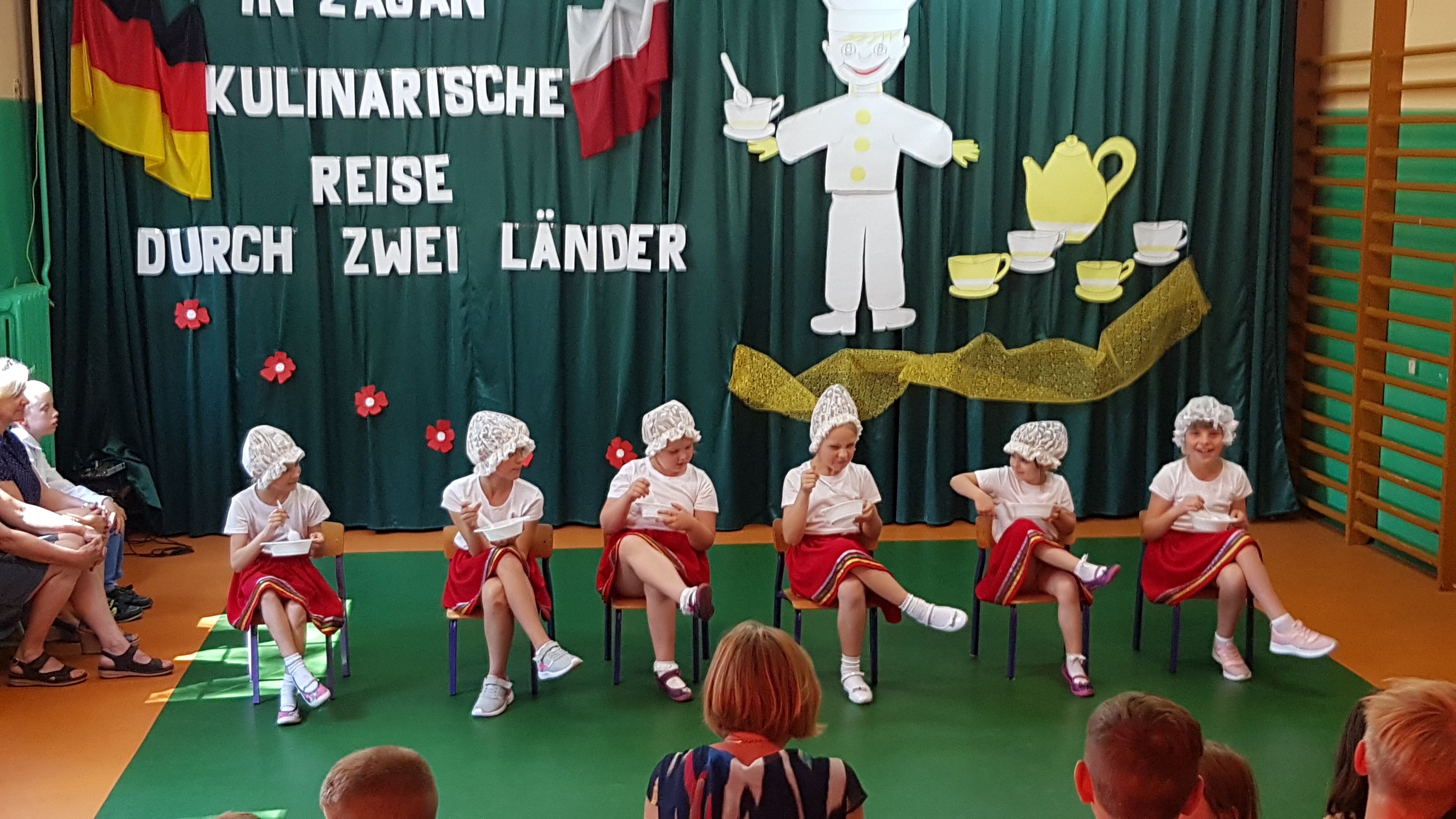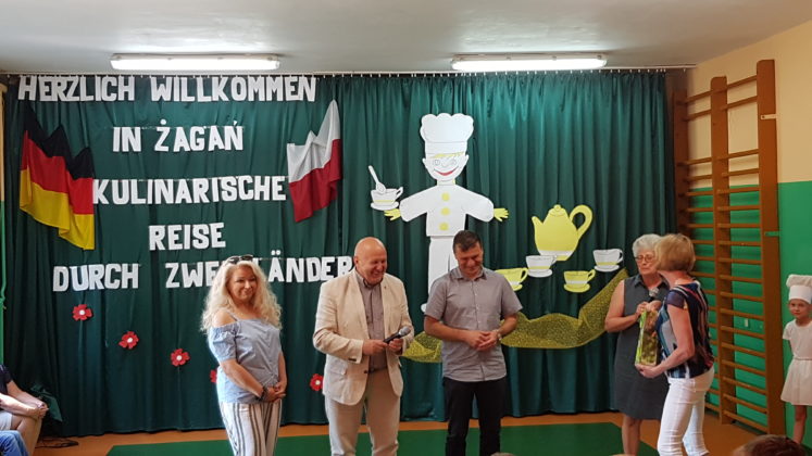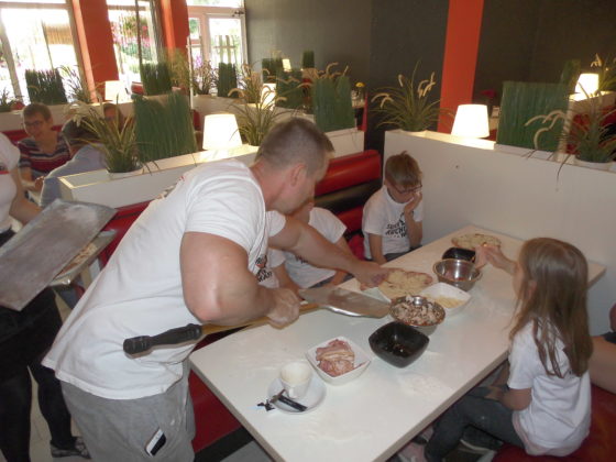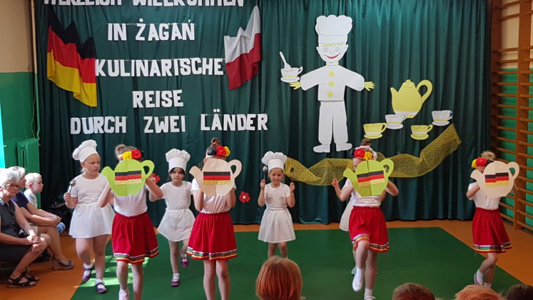 W czwartek 6 czerwca br. miała miejsce rewizyta uczniów z partnerskiej szkoły z Ortrand, którzy przyjechali do nas, by uczestniczyć w kolejnym już projekcie polsko-niemieckim ,,Podróż kulinarna po Polsce i Niemczech z naszymi przyjaciółmi”. Po przyjeździe na miejsce goście zostali przywitani przez panią dyrektor Danutę Urban oraz przedstawicieli Urzędu Miasta – Adama Matwijowa, przewodniczącego Rady Miasta i naczelnika Wydziału Oświaty, Mariusza Krugłego. W sali gimnastycznej uczennice z zespołu tanecznego oraz najmłodsi uczniowie wraz z przedszkolakami z oddziału przedszkolnego poprzez taniec wprowadzili wszystkich w tematykę kulinarną spotkania. Na koniec próbowano pysznych kopytek oraz kapuśniaku przygotowanych przez naszych uczniów. Kolejnym punktem programu były warsztaty robienia pizzy, które odbyły się pod czujnym okiem pracowników pizzerii Mafia. Uczestniczyli w nich uczniowie z Niemiec i czwartoklasiści. Każdy mógł przygotować dla siebie taką pizzę, jaką najbardziej lubi. Każdy z uczestników otrzymał piękny certyfikat. Przy okazji pokazaliśmy naszym gościom Pałac Książęcy i galerię Dobrego Diabła. W ramach integracji rozegraliśmy na Arenie turniej w kręgle.