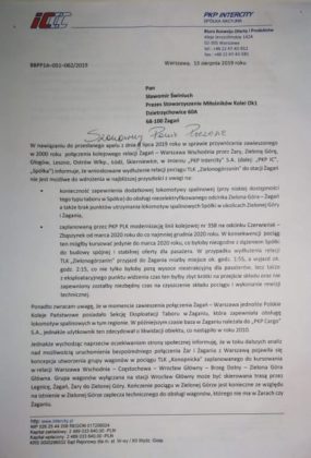 Dokument przesłał pomysłodawca akcji przywrócenia połączenia kolejowego Żagania z Warszawą, Sławomir Świniuch.