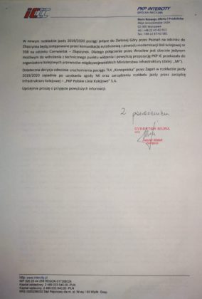 Pismo jest odpowiedzią na petycję stworzoną przez Stowarzyszenie, które było również inicjatorem pomysłu przywrócenia połączenia naszego miasta ze stolicą. Zaproponowana przez miłośników kolei akcja zyskała Państwa poparcie. W ślad za kartami pocztowymi z podpisami mieszkańców, żagański magistrat rozesłał pisma skierowane do parlamentarzystów z naszego regionu z prośbą o wsparcie prowadzonych działań. Odpowiedź PKP Intercity z 13 sierpnia 2019 roku stanowi podstawę do kontynuacji rozmów z PKP S.A. i realną szansę na zmianę istniejącej siatki połączeń kolejowych.