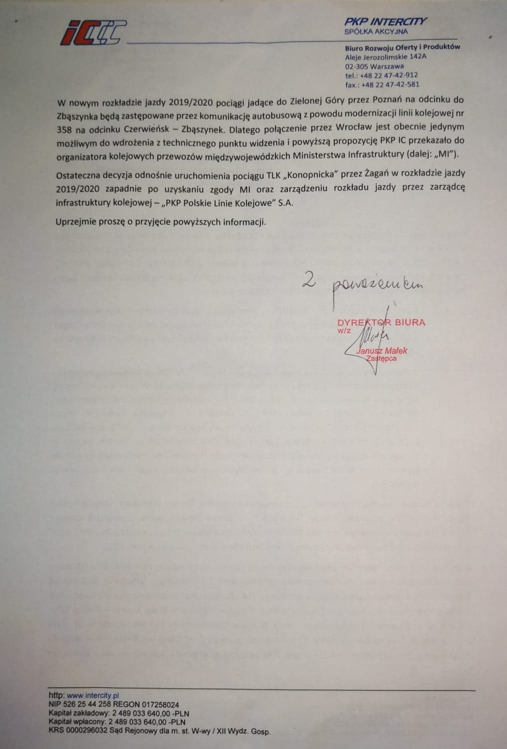 Stowarzyszenie Miłośników Kolei OK1 przekazało nam dzisiaj doskonałą wiadomość – pismo od PKP Intercity S.A., w którym poinformowano, iż w toku dalszych analiz nad możliwością uruchomienia bezpośredniego połączenia Żar i Żagania z Warszawą pojawiła się koncepcja utworzenia grupy wagonów w pociągu TLK “Konopnicka” (…) Wagony te byłyby wyłączane na stacji Wrocław Główny i kierowane trasą na Legnicę, Żagań, Żary do Zielonej Góry. Wspomniane zmiany mogą zostać uwzględnione w rozkładzie jazdy 2019/2020 dopiero po uzyskaniu zgody Ministerstwa Infrastruktury.