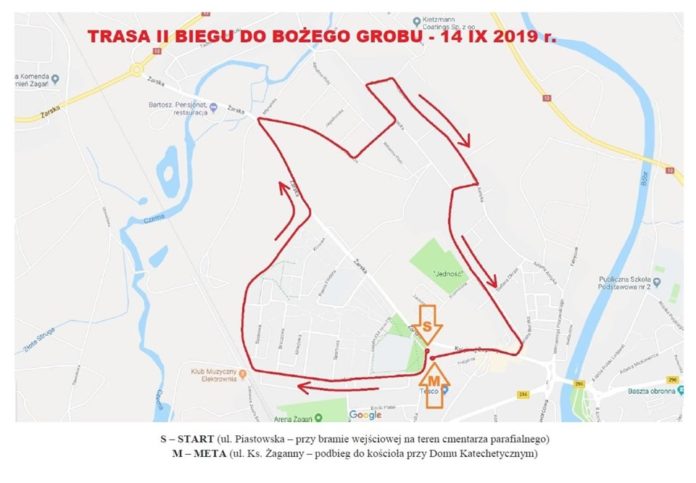 W związku z II Biegiem do Bożego Grobu informujemy o utrudnieniach, które w rejonie parafii Nawiedzenia Najświętszej Marii Panny w Żaganiu wystąpią w sobotę 14 września. Zamknięcie trasy biegu nastąpi o godzinie 11.00. Po rozpoczęciu biegu o godzinie 11.44 ulice będą otwierane dla ruchu. Całkowite zakończenie utrudnień w tym rejonie przewidywane jest na godzinę 13.00. Start biegu nastąpi z ulicy Piastowskiej, przy kościele „Na Górce”. Uczestnicy pokonają dystans 4444 metrów.