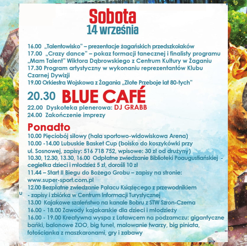 W części artystycznej na godz. 16.00 zaplanowano Talentowisko, czyli prezentacje żagańskich przedszkolaków. O 17.00 będzie miał miejsce pokaz formacji tanecznej i finalisty programu “Mam Talent”. O 20.30 zapraszamy na występ gwiazdy wieczoru – Blue Cafe.