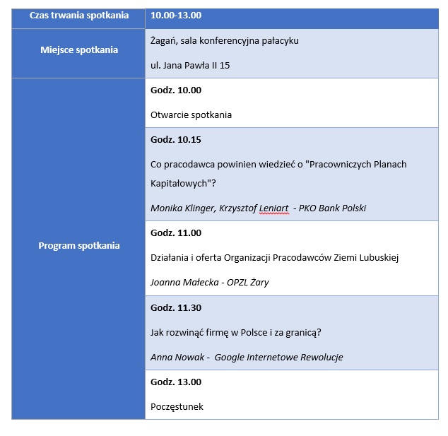 W trakcie spotkania przedstawiciele PKO Banku Polskiego przybliżą uczestnikom zagadnienia związane z Pracowniczymi Planami Kapitałowymi, Kierownik Oddziału OPZL w Żarach opowie o działaniach podejmowanych przez organizację na rzecz żagańskich przedsiębiorstw, a doradca projektu Google Internetowe Rewolucje podpowie jak rozwinąć firmę w Polsce i zagranicą. Szczegółowe informacje dostępne są poniżej.
