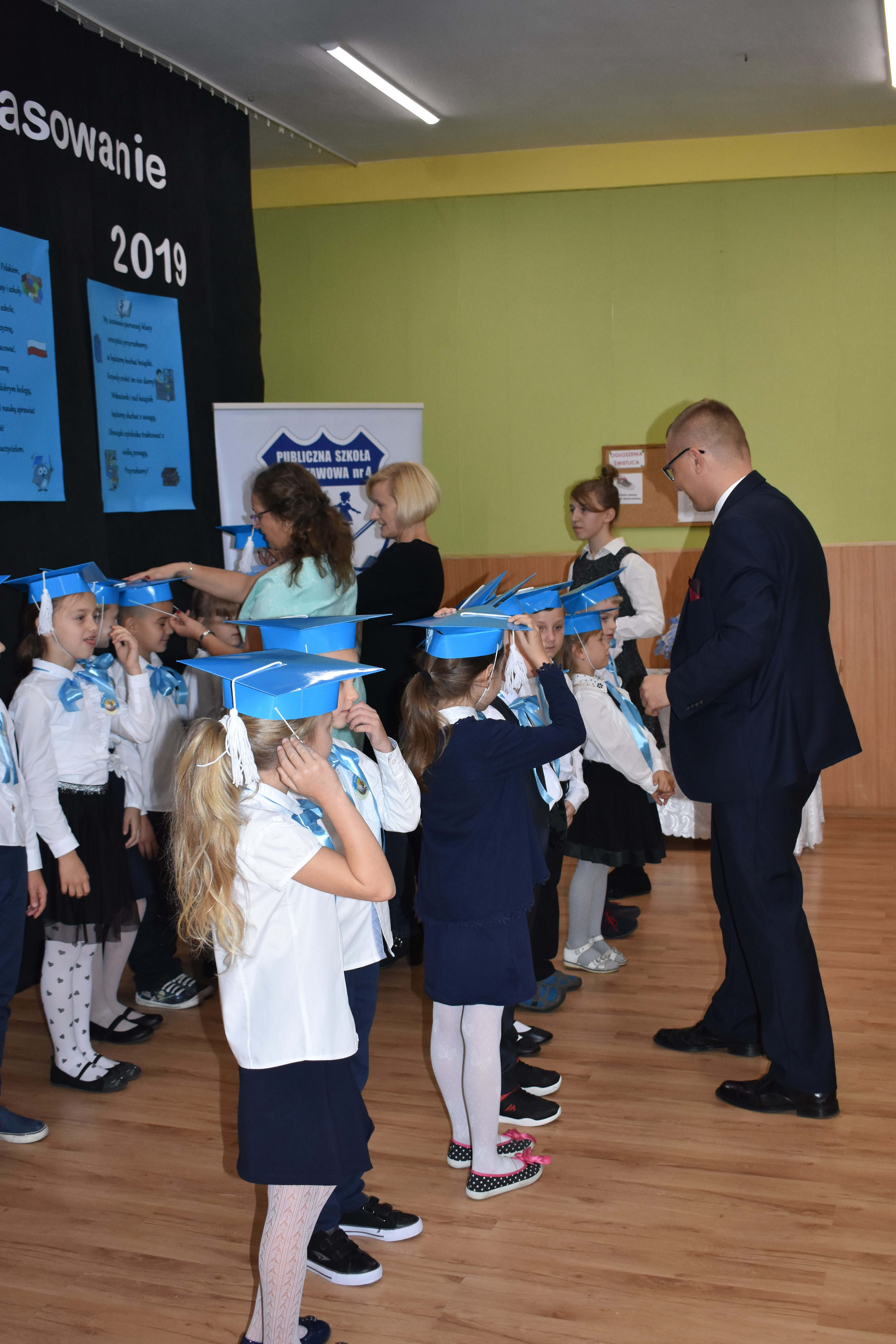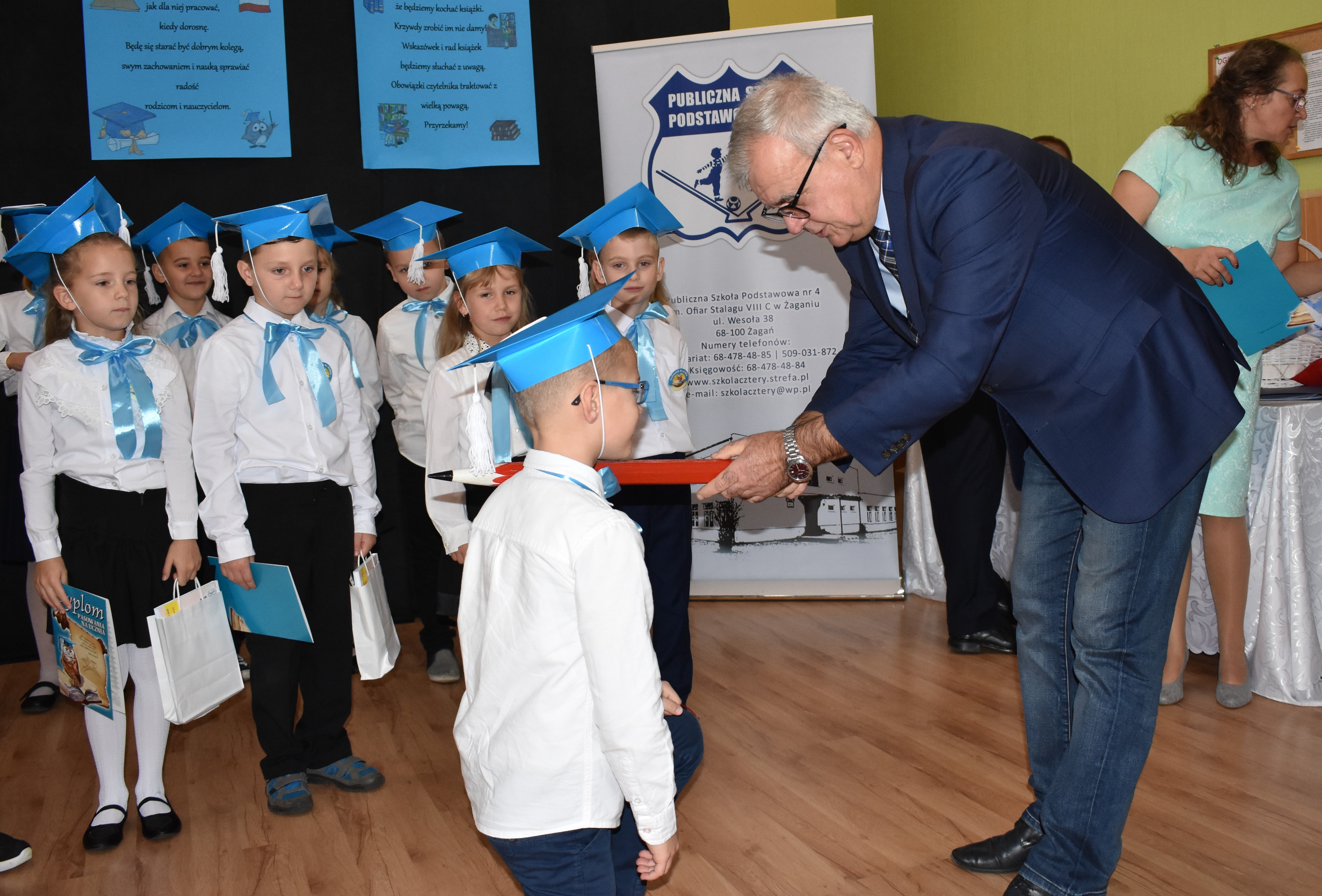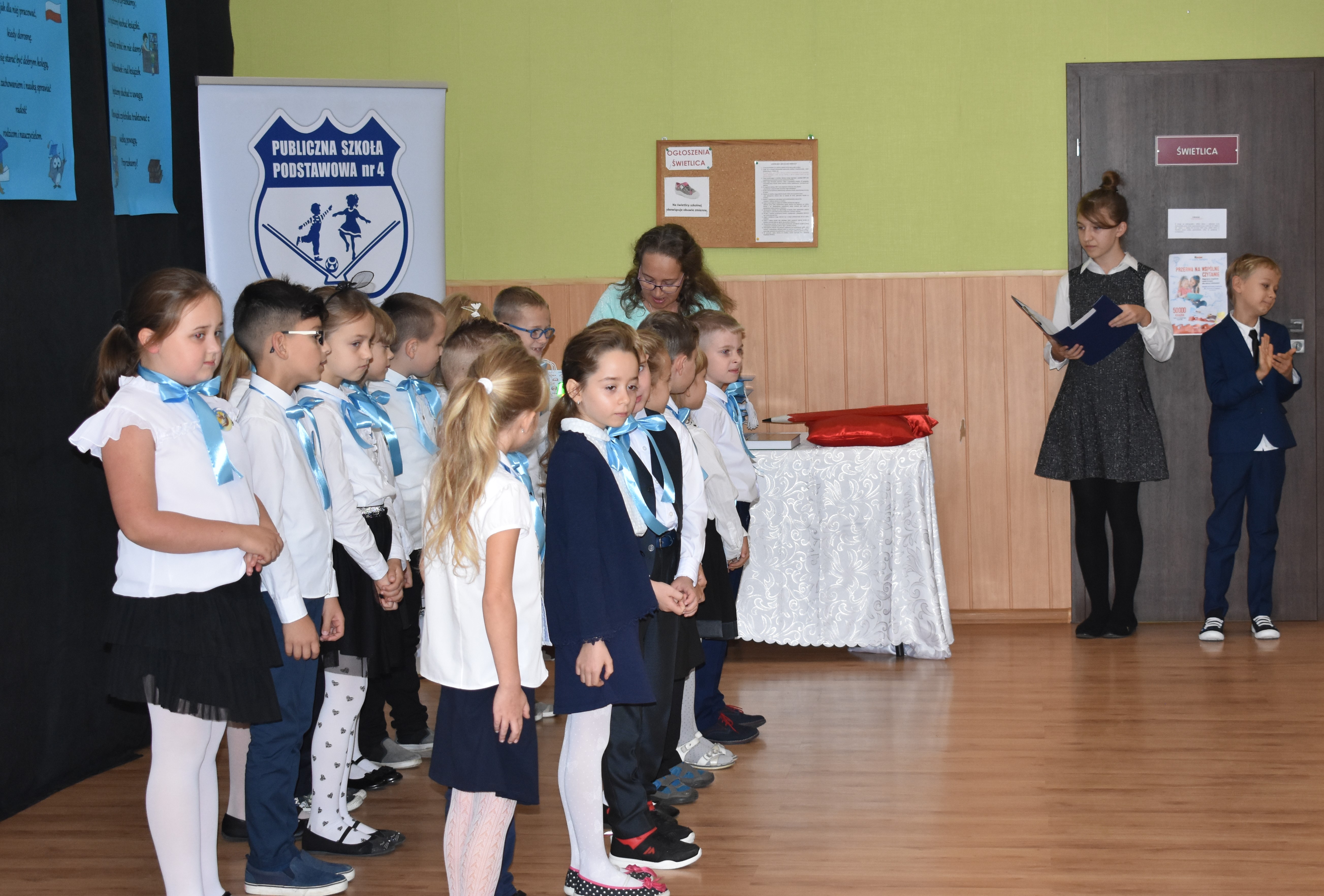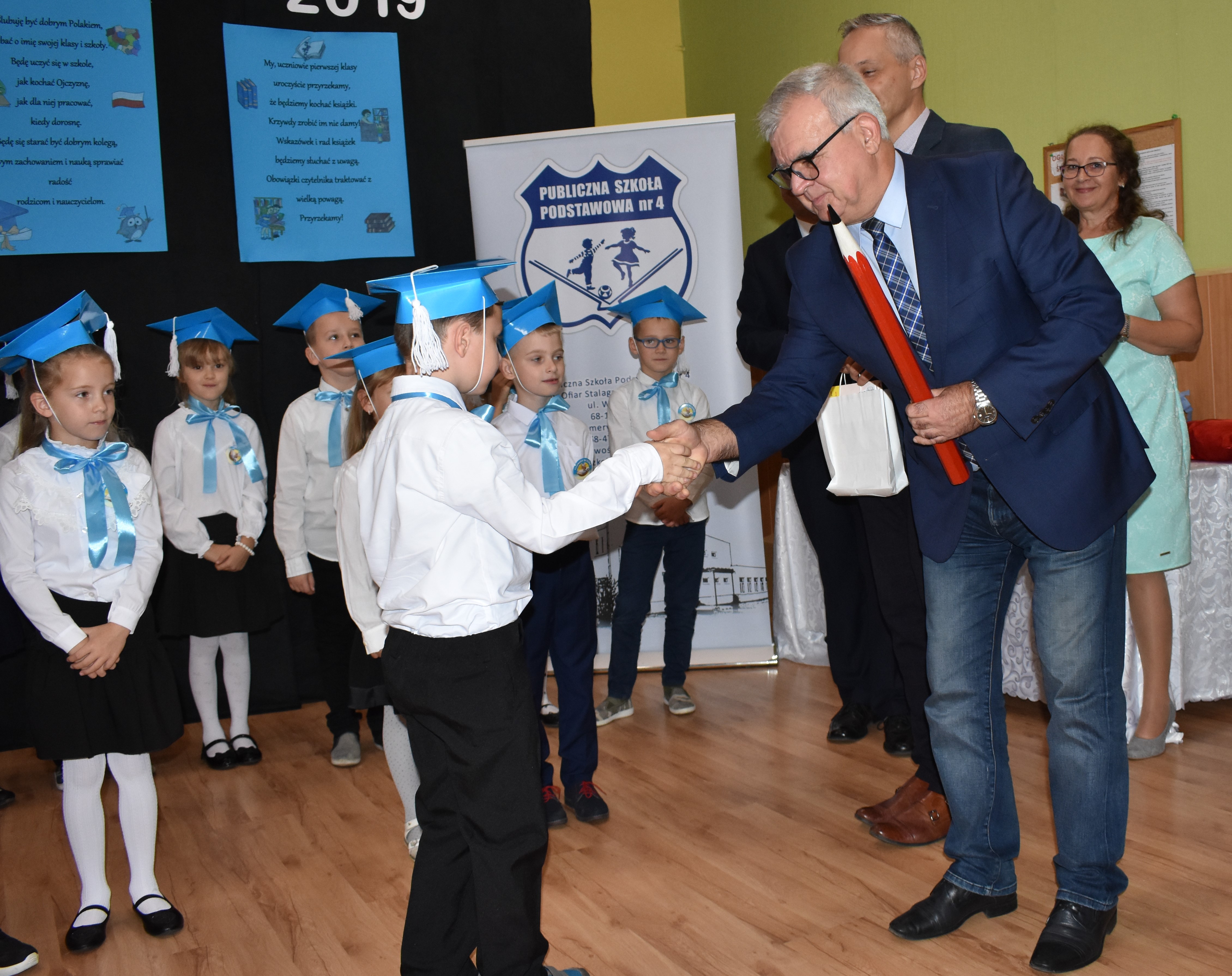 24 października 2019 roku do społeczności uczniowskiej w PSP nr 4 przystąpiło siedemnastu nowych żaków. W trakcie uroczystości dzieci zaprezentowały swoje umiejętności taneczne, wokalne i recytatorskie, udowadniając tym samym swoją gotowość do rozpoczęcia nauki. Pierwszoklasiści złożyli uroczyste ślubowanie, a następnie każde dziecko zostało pasowane przez burmistrza Andrzeja Katarzyńca na ucznia Publicznej Szkoły Podstawowej nr 4 w Żaganiu. Pełnoprawni uczniowie odbierali następnie gratulacje od dyrektora szkoły Piotra Pałaca, wychowawczyni Arlety Ciołkowskiej oraz zastępcy burmistrza Sebastiana Kuleszy, który wręczał najmłodszym drobne upominki. Tomasz Prus pasował każdego ucznia na czytelnika, zachęcając do korzystania ze szkolnej biblioteki i dbania o papierowych przyjaciół.
