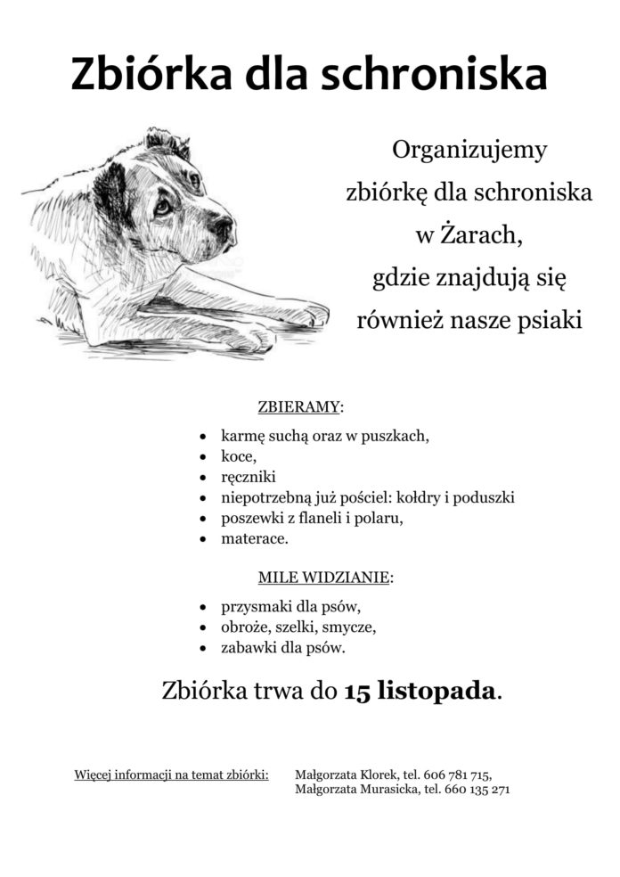 W imieniu radnej Małgorzaty Klorek oraz wolontariuszki Małgorzaty Murasickiej przypominamy o zbiórce karmy oraz kocy dla zwierzaków z żarskiego schroniska. Wszystkie zebrane przedmioty przekazane zostaną placówce, w której przebywają również żagańskie psy. Osoby zainteresowane przekazaniem potrzebnych produktów mogą zostawić je w naszych szkołach i przedszkolach oraz w OPS w Żaganiu (ul. Włókniarzy 3, pokój nr 4). W razie dodatkowych pytań zachęcamy do kontaktu z organizatorkami zbiórki. Akcja potrwa do 15 listopada 2019 roku.