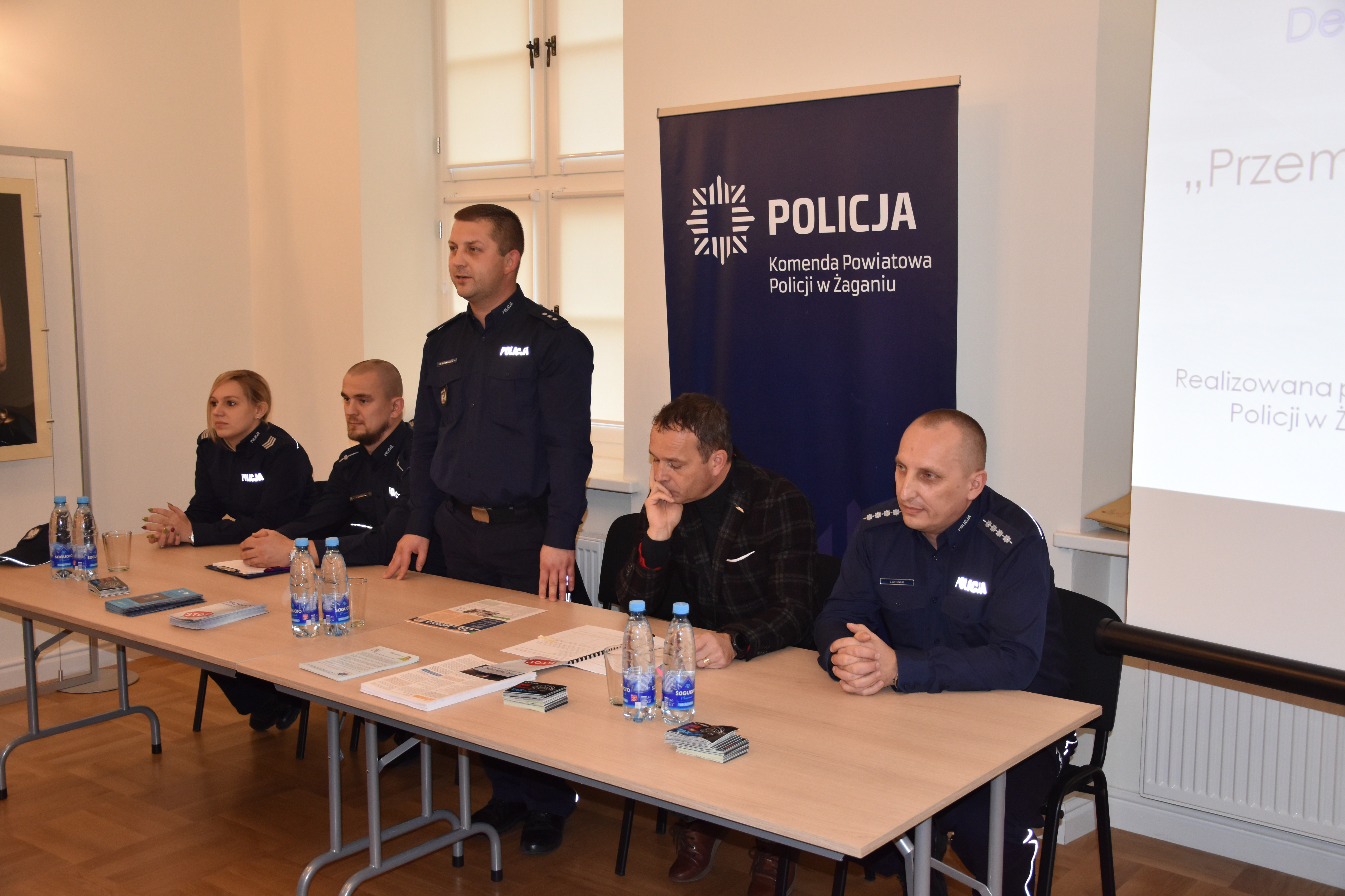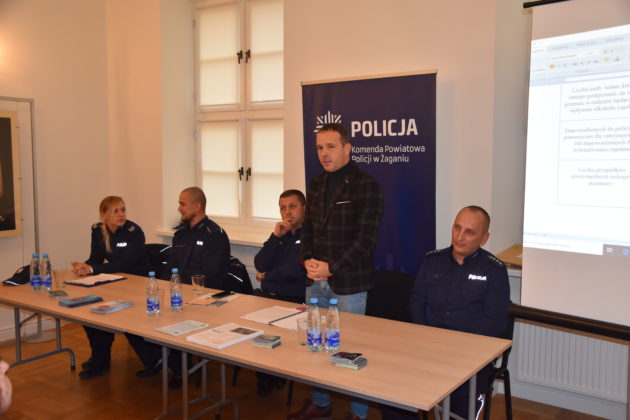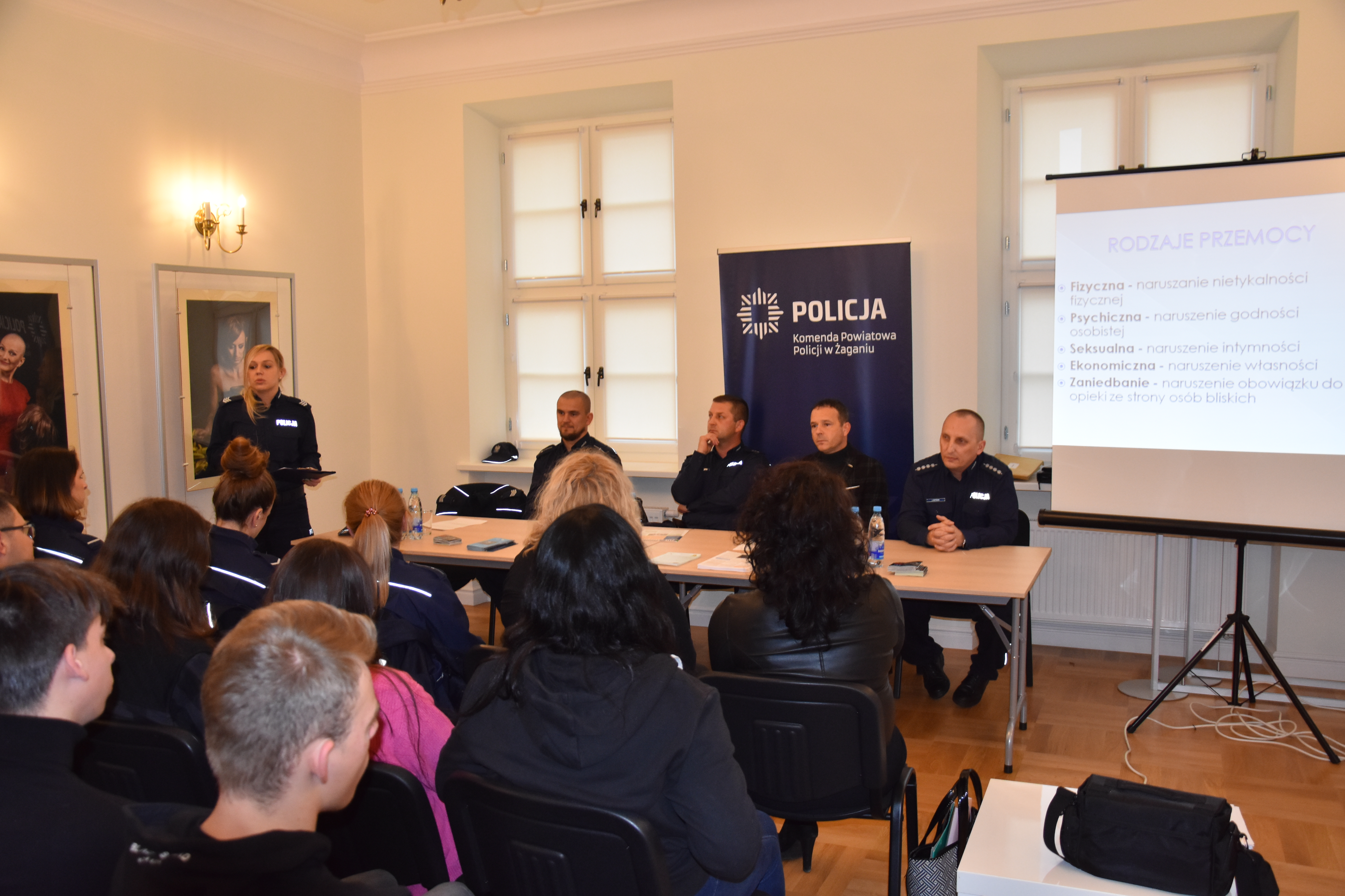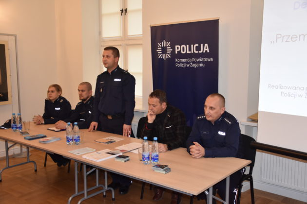 Przedstawione zostały także dane statystyczne dotyczące interwencji domowych związanych z przemocą oraz liczba osób dotkniętych przemocą domową i stosujących przemoc na terenie Żagania w roku 2018 i w okresie od stycznia do listopada 2019 r. Uczestnicy dowiedzieli się, jakie instytucje poza Policją mogą założyć rodzinie Niebieską Kartę oraz gdzie na terenie Żagania pokrzywdzone osoby mogą szukać pomocy.