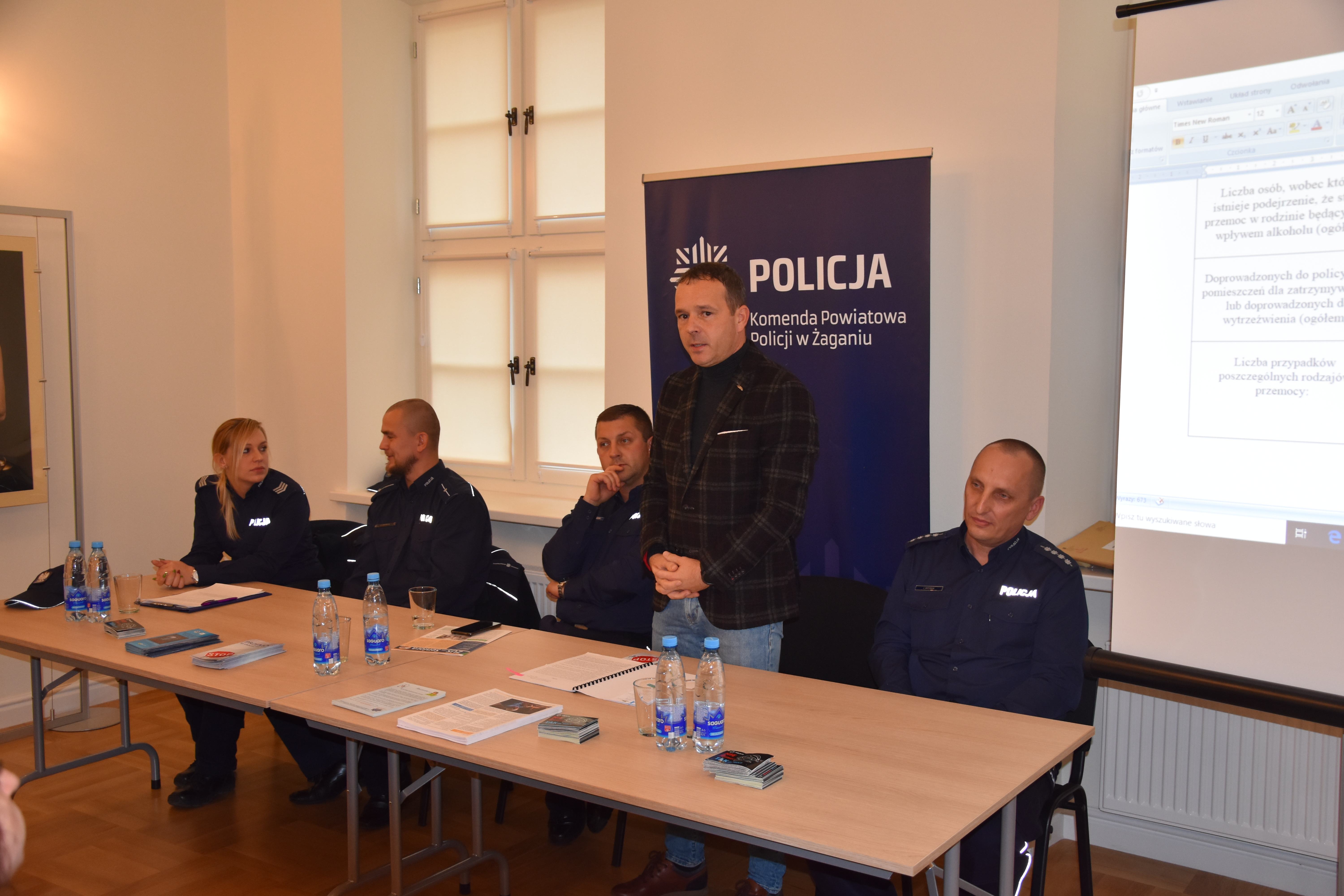 Kierownik Miejskiego Ośrodka Pomocy Społecznej w Żaganiu, a zarazem Przewodniczący Zespołu Interdyscyplinarnego Piotr Puchalski omówił zakres pracy Zespołów Interdyscyplinarnych, jakie czynności są wykonywane od momentu wszczęcia procedury Niebieskiej Karty, aż do jej zakończenia oraz przedstawił dane statystyczne dotyczące tego zjawiska.