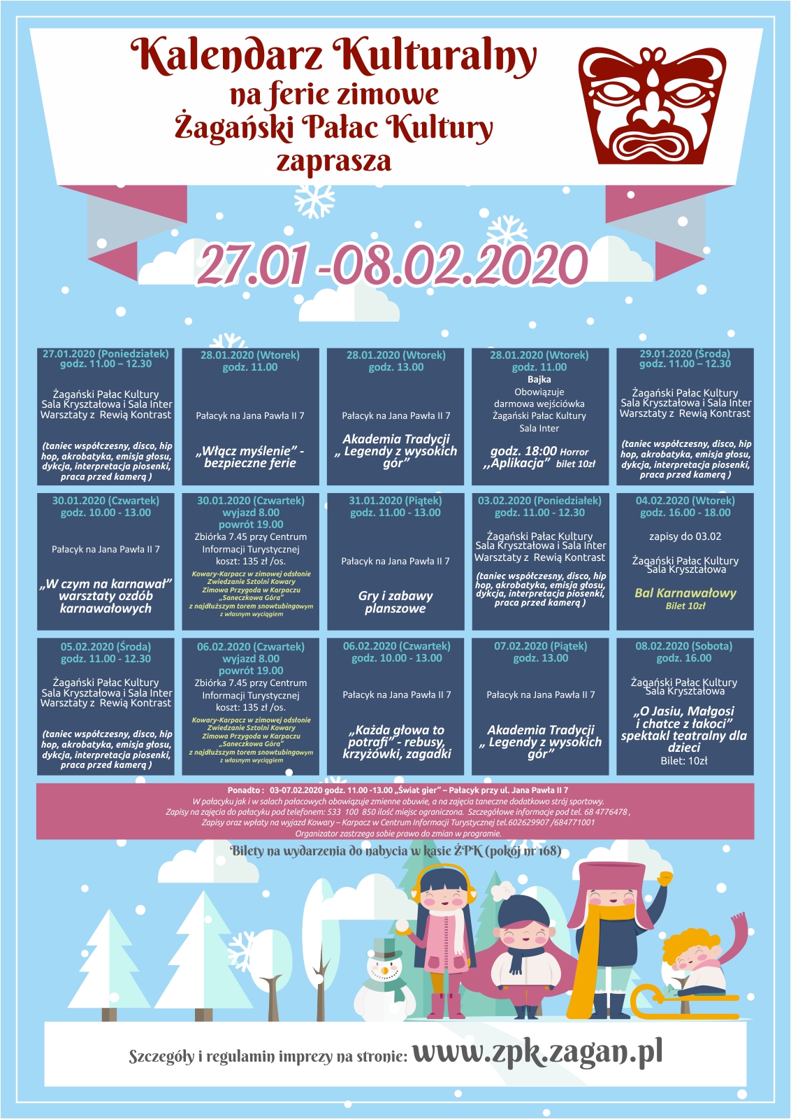 Na zajęcia zaprasza również Żagański Pałac Kultury. W salach Pałacu Książęcego oraz Pałacyku przy ul. Jana Pawła II 7 w Żaganiu przygotowano dla dzieci mnóstwo atrakcji m.in: warsztaty tańca współczesnego z Rewią Kontrast, teatrzyk, Akademię Tradycji, seanse bajkowe, kino dla młodzieży, gry i zabawy planszowe, bal karnawałowy, wycieczkę do Karpacza.