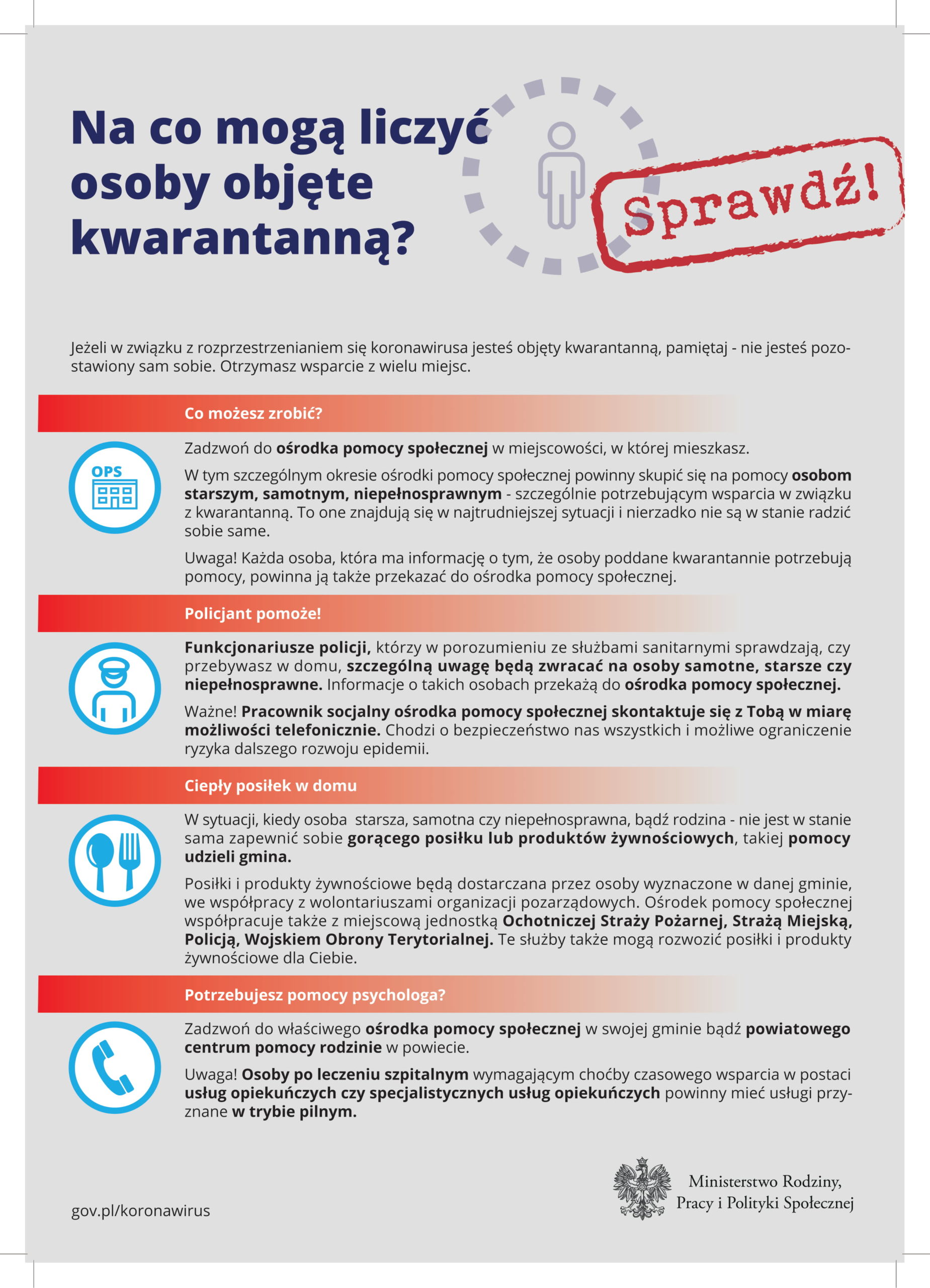 Szczegółowe informacje  na co możesz liczyć, gdy jesteś objęty kwarantanną, kto udzieli Ci wsparcia i pomocy, znajdziesz na stronie: