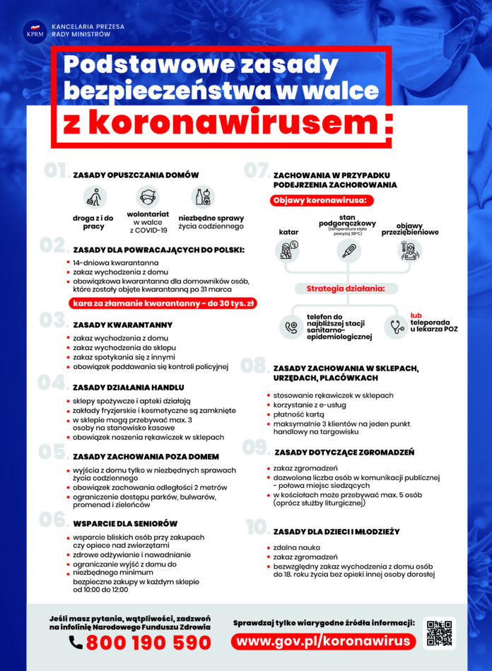 MSWiA wydało nowe zalecenia dotyczące zasad bezpieczeństwa w walce z koronawirusem. Zachęcamy do korzystania z plakatu i udostępniania go publicznie. W przygotowanych materiałach znaleźć można odpowiedzi na najczęściej zadawane pytania w związku z epidemią. 11 plakatów wyjaśnia: