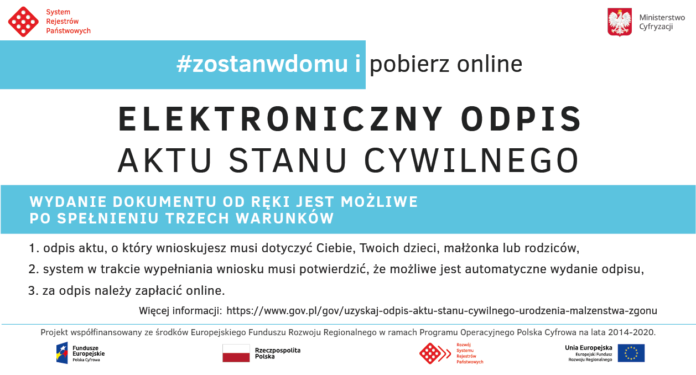 Nowa odsłona e-usługi to jedno z działań w ramach projektu Rozwój Systemu Rejestrów Państwowych POPC.  Wszystkie informacje dotyczące elektronicznego składania wniosku i pobrania odpisu aktu stanu cywilnego znajdują się na rządowej stronie – www.gov.pl