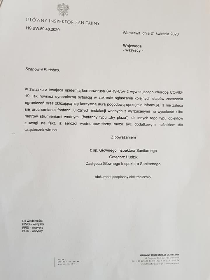 W związku z pytaniami dotyczącymi niedziałających fontann przypominamy, że wynika to z zaleceń Głównego Inspektora Sanitarnego z dnia 21 kwietnia 2020 roku. Zalecenia te przekazał samorządom wojewoda lubuski. Z zaleceń tych wynika, aby nie uruchamiać urządzeń, które rozpylają wodę. Ograniczenia te wprowadzono z uwagi na sytuację epidemiczną w całym kraju. Do tej pory nie zostały one odwołane.