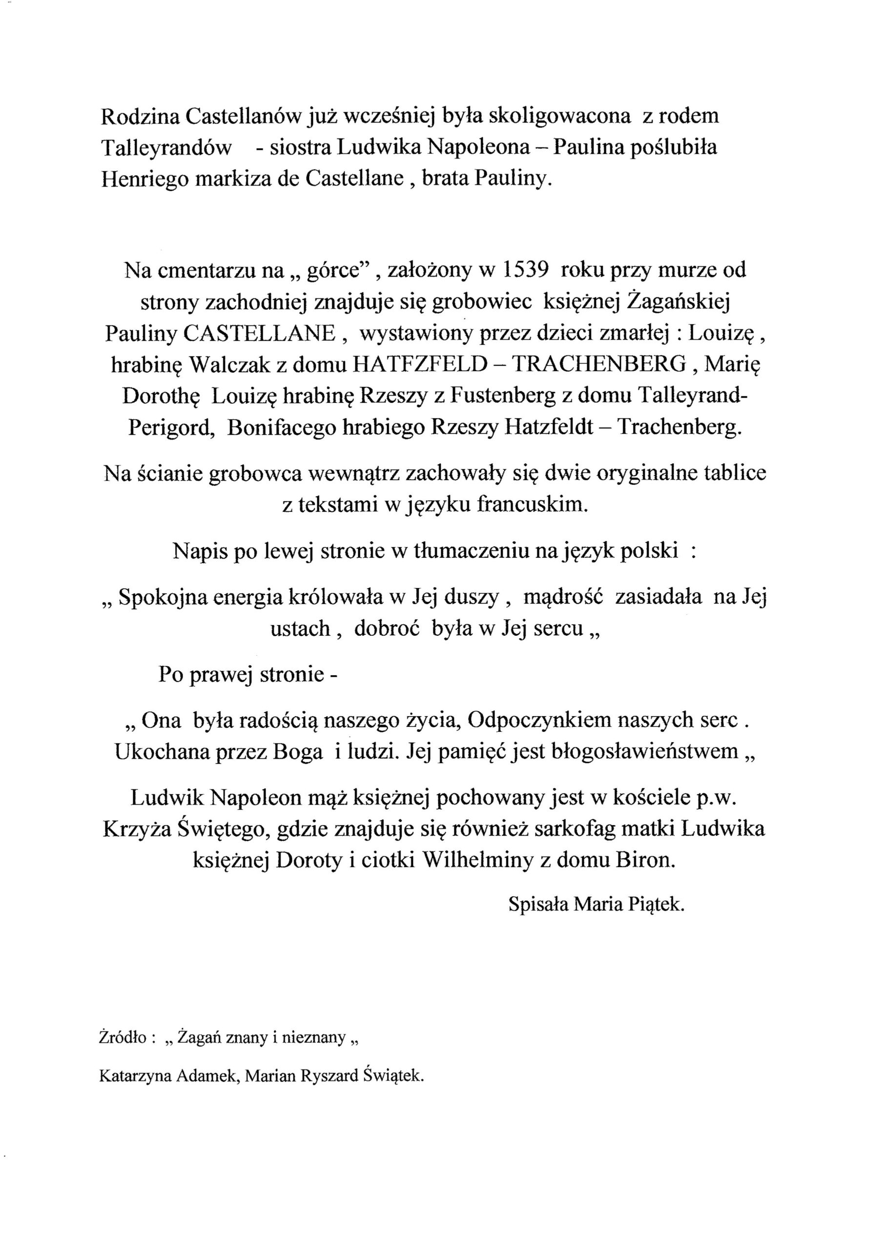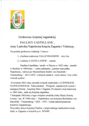 Dziś na tablicy przy Centrum Informacji Turystycznej w Żaganiu (ul. Szprotawska 4) pojawi się specjalna ekspozycja przygotowana przez Towarzystwo Przyjaciół Żagania. Dotyczy ona grobowca księżnej żagańskiej Pauliny Castellane, znajdującego się na cmentarzu “na górce” przy ulicy Piastowskiej. Wszystkich mieszkańców oraz turystów zachęcamy do zapoznania się z przygotowanymi materiałami. Jednocześnie pragniemy poinformować, że ekspozycje znajdujące się w tym miejscu będą zmieniane w sposób cykliczny, dlatego warto na bieżąco śledzić pojawiające się treści.