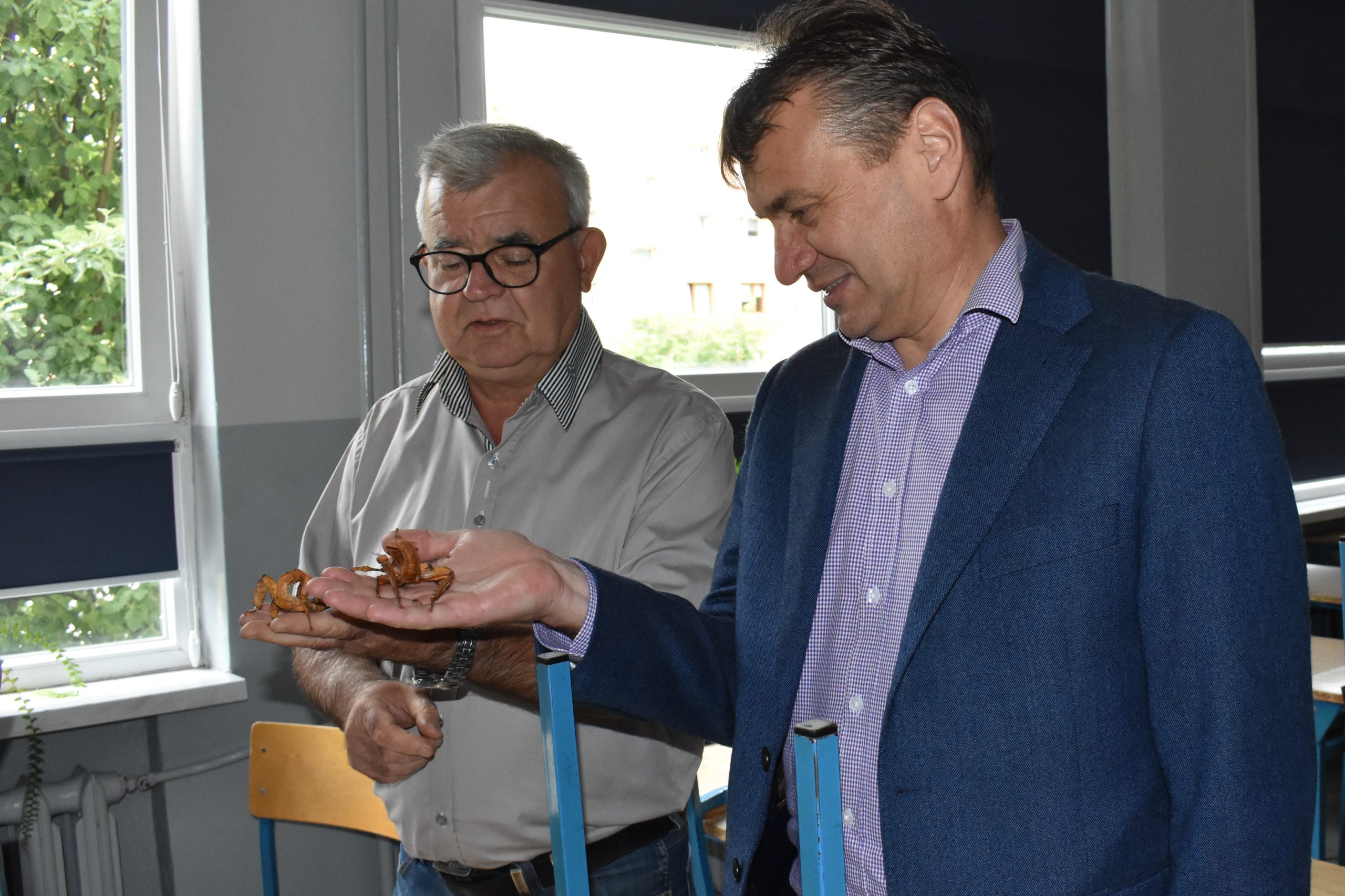 Na zakończenie burmistrz Andrzej Katarzyniec wspólnie z naczelnikiem oświaty Mariuszem Krugłym odwiedził gabinet biologiczny w PSP 5. Dzięki opiece pani Alicji Stąpel szkoła wzbogaciła się o rodzinę straszyków australijskich. Dzieci na przykładzie tych małych roślinożernych owadów obserwują rozwój gatunku, dowiadują się, jak wygląda wylinka, oswajając się ze światem owadów. W tej chwili straszyków jest tak dużo, że opiekunka chętnie odda kilka innym miejskim placówkom. Owady powędrują w ręce nowych właścicieli wraz z informacjami na temat prawidłowej ich pielęgnacji. Gratulujemy pani Alicji zaangażowania i pasji.