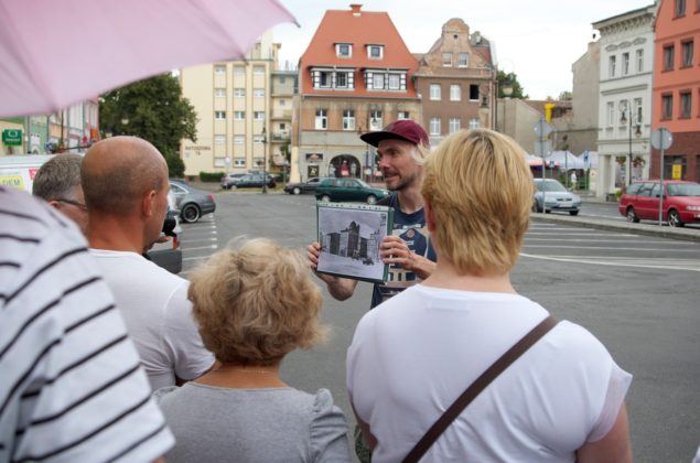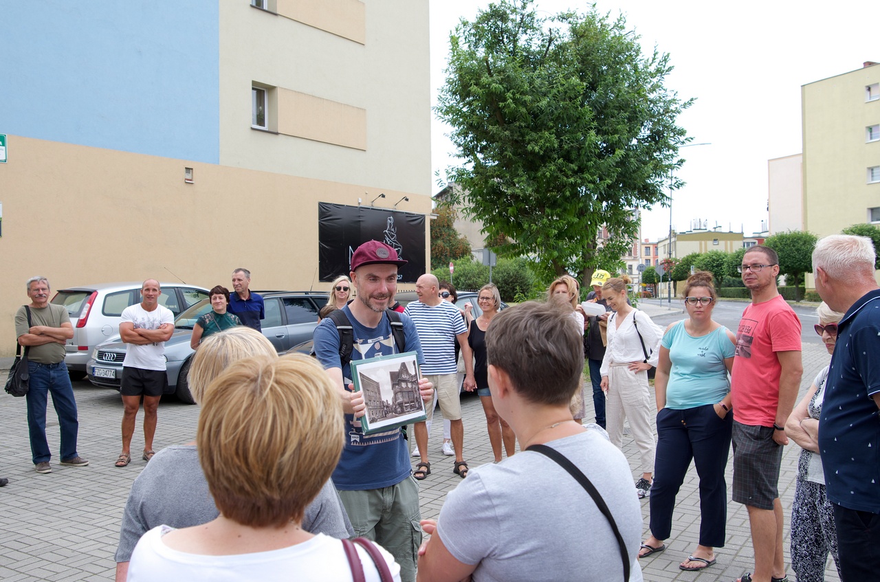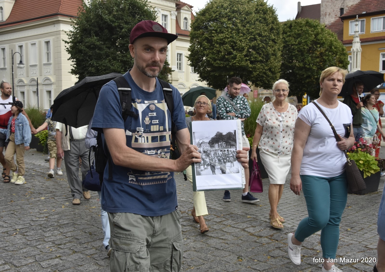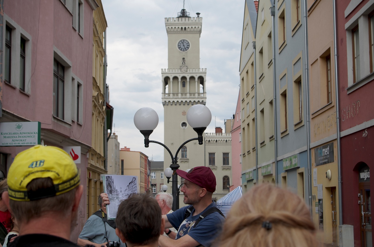Spacer rozpoczął się przy fontannie na pl. Słowiańskim dosyć porywiście, gdyż nad miasto nadciągała nawałnica. Jednak natura okazała się łaskawa i jak to często w Żaganiu bywa, burza przeszła obok. Tak więc, mimo sporadycznego deszczu udało się przejść całą zaplanowaną trasę. Koncepcja spaceru polegała na tym, aby na kolejnych przystankach opowiedzieć skondensowaną do krótkich informacji historię danego miejsca, a następnie odkrywać nieistniejące na tle tego, co ocalało. Z pomocą przychodziły tu dawne pocztówki i powojenne archiwalne zdjęcia autorstwa m.in. Jana Mazura. Istotne znaczenie miała również wspólna praca z wyobraźnią. Społeczny proces, integracja i poczucie lokalnej wspólnoty to niezbędny element spacerów firmowanych przez Odkrywanie Żagania, stąd ten aspekt był niezwykle ważny.