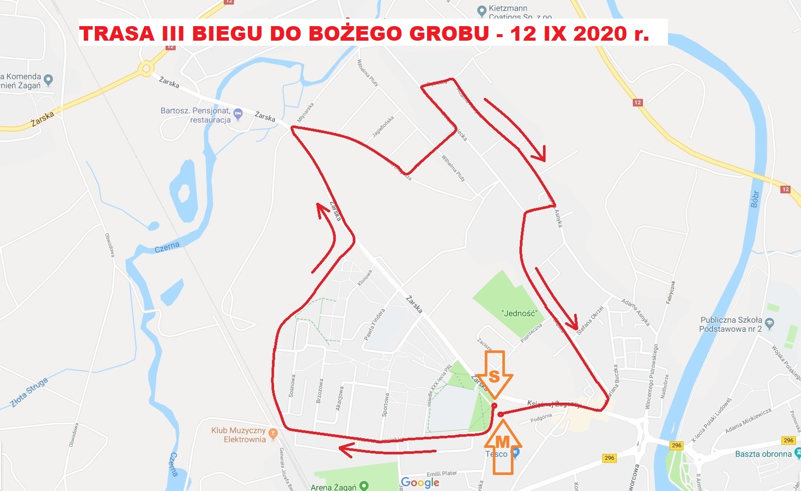 START nastąpi o godz. 14:44 bezpośrednio z ul. Piastowskiej (przy wejściu na teren cmentarza Parafii NNMP). Zawodnicy pobiegną następnie ulicami M. Konopnickiej, Sosnową (obwodnica), Żarską (od Kościoła Garnizonowego do ul. Młynarskiej), Długosza, Stromą, Bolesławiecką, Dębową, Asnyka, Zamkową, Śląską, Lubuską, Księżnej Żaganny. Metę zaplanowano przy domu katechetycznym Parafii Nawiedzenia Najświętszej Maryi Panny.