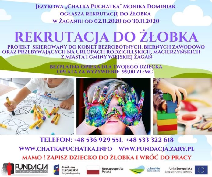 Mamy powracające na rynek pracy zapraszamy do udziału w programie Fundacji Przedsiębiorczość oraz żłobka “Chatka Puchatka”. Dzięki pozyskanemu dofinansowaniu utworzone zostanie dodatkowych 10 miejsc w żłobku dla dzieci kobiet z miasta i gminy wiejskiej Żagań, które powrócą na rynek pracy po przerwie związanej z urodzeniem/ wychowaniem dziecka. Dzięki projektowi dla 10 kobiet zostanie zorganizowana opieka i sfinansowane koszty opieki nad dziećmi do lat 3 w nowym oddziale żłobka Językowa ,,Chatka Puchatka” Monika Dominiak przez okres 22 miesięcy.