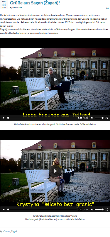 Również członkowie żagańskiego stowarzyszenia “Miasto bez Granic”, przy wsparciu ze strony pracowników Urzędu Miasta Żagań, przesłali pozdrowienia dla przyjaciół z partnerskiej organizacji “Teltow ohne Grenzen”.