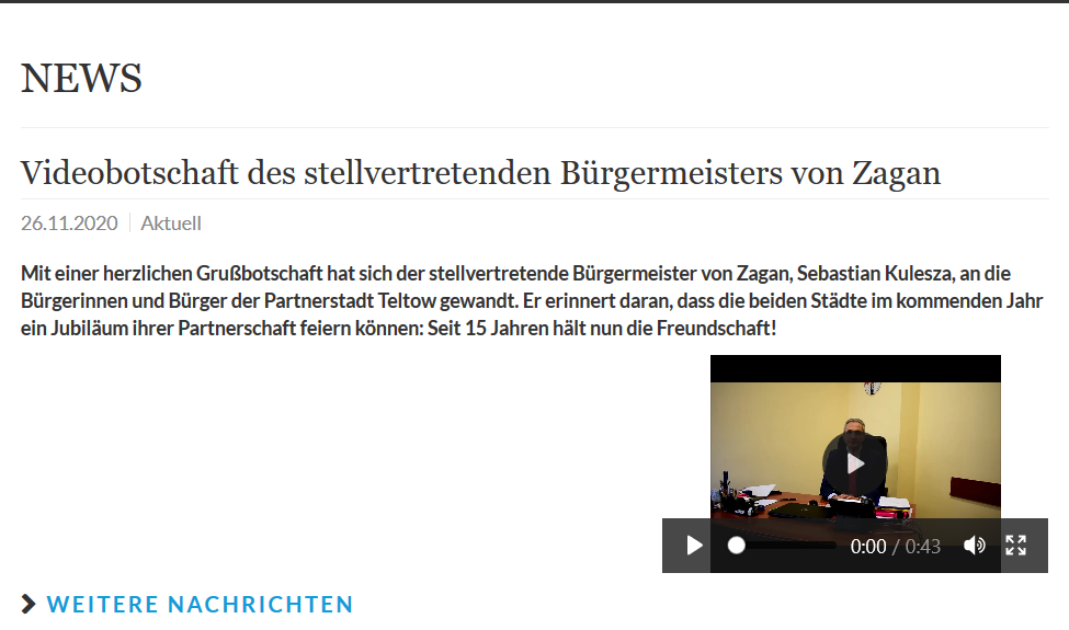 Zastępca burmistrza Sebastian Kulesza, zwrócił się niedawno do mieszkańców Teltow z ciepłym pozdrowieniem. Przypomniał, że w przyszłym roku  będziemy obchodzić 15 rocznicę  partnerstwa naszych miast.