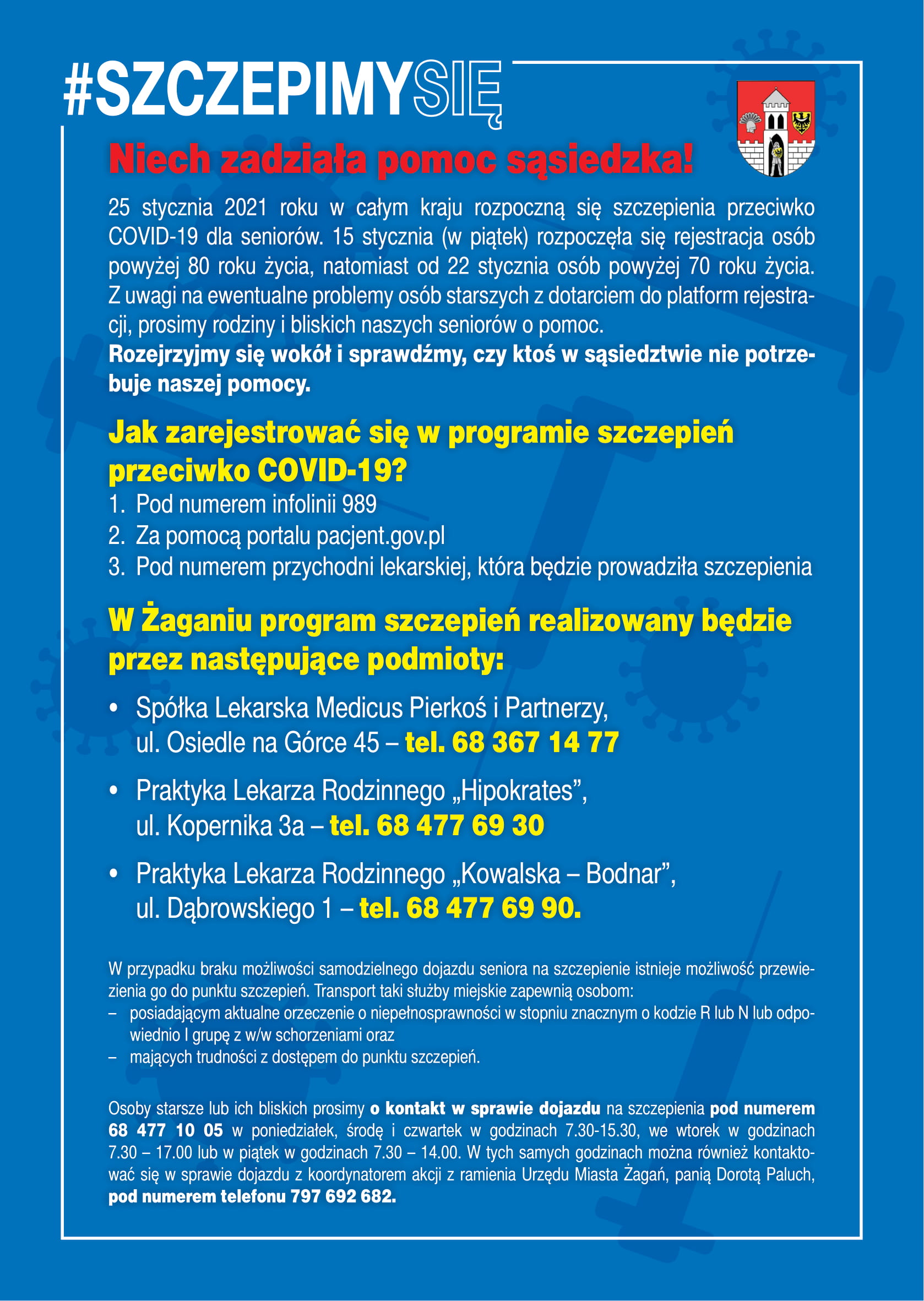 25 stycznia 2021 roku w całym kraju rozpoczną się szczepienia przeciwko COVID-19 dla seniorów. Już 15 stycznia (w piątek) rozpocznie się rejestracja osób powyżej 80 roku życia, natomiast od 22 stycznia osób powyżej 70 roku życia. Rejestracji takiej można dokonać pod numerem infolinii 989, za pomocą portalu pacjent.gov.pl oraz pod bezpośrednim numerem POZ, która zgłosiła się do programu szczepień. W Żaganiu są to następujące podmioty: