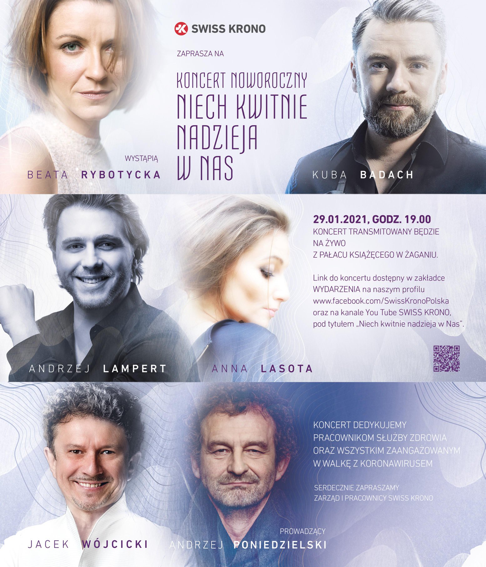 Jest nam niezmiernie miło, że żarska firma SWISS KRONO zaufała nam i już 29 stycznia z największej i najbardziej reprezentacyjnej Sali Kryształowej Żagańskiego Pałacu Kultury o godz. 19.00 będzie transmitowany on-line na żywo Koncert Noworoczny zatytułowany „Niech kwitnie nadzieja w nas”. Koncert odbędzie się bez udziału publiczności.