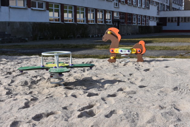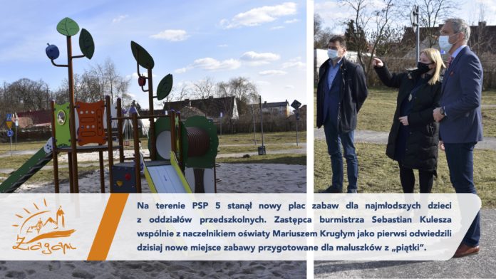 Na terenie PSP 5 stanął nowy plac zabaw dla najmłodszych dzieci z oddziałów przedszkolnych. Zastępca burmistrza Sebastian Kulesza wspólnie z naczelnikiem oświaty Mariuszem Krugłym jako pierwsi odwiedzili dzisiaj nowe miejsce zabawy przygotowane dla maluszków z „piątki”. Nowe elementy służące do zabawy na świeżym powietrzu zamontowano w pobliżu wyjścia z sal dla najmłodszych, na tyłach budynku szkolnego. Wszystkie urządzenia zostały zakupione w ubiegłym roku. Zimowa odwilż pozwoliła je osadzić bezpiecznie w gruncie dopiero teraz. Wokół zjeżdżalni, bujaków oraz huśtawki zapewniono dzieciom bezpieczne podłoże. Życzymy udanej zabawy!