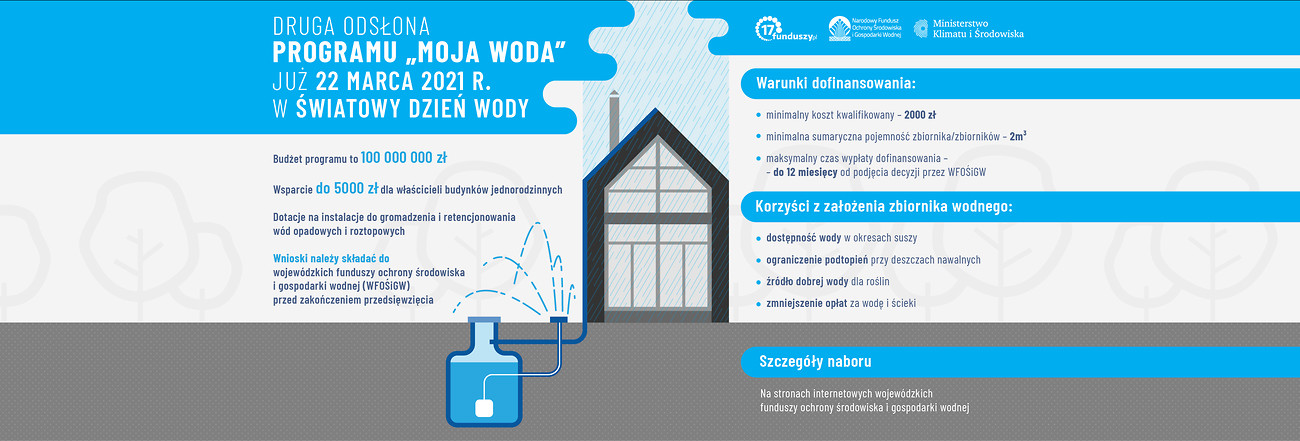 W Światowy Dzień Wody, 22 marca 2021 r., Narodowy Fundusz Ochrony Środowiska i Gospodarki Wodnej uruchamia drugą odsłonę programu „Moja Woda”. Wnioski o dotacje do 5 tysięcy złotych na przydomowe instalacje zatrzymujące wody opadowe i roztopowe można składać do wojewódzkich funduszy ochrony środowiska i gospodarki wodnej.
