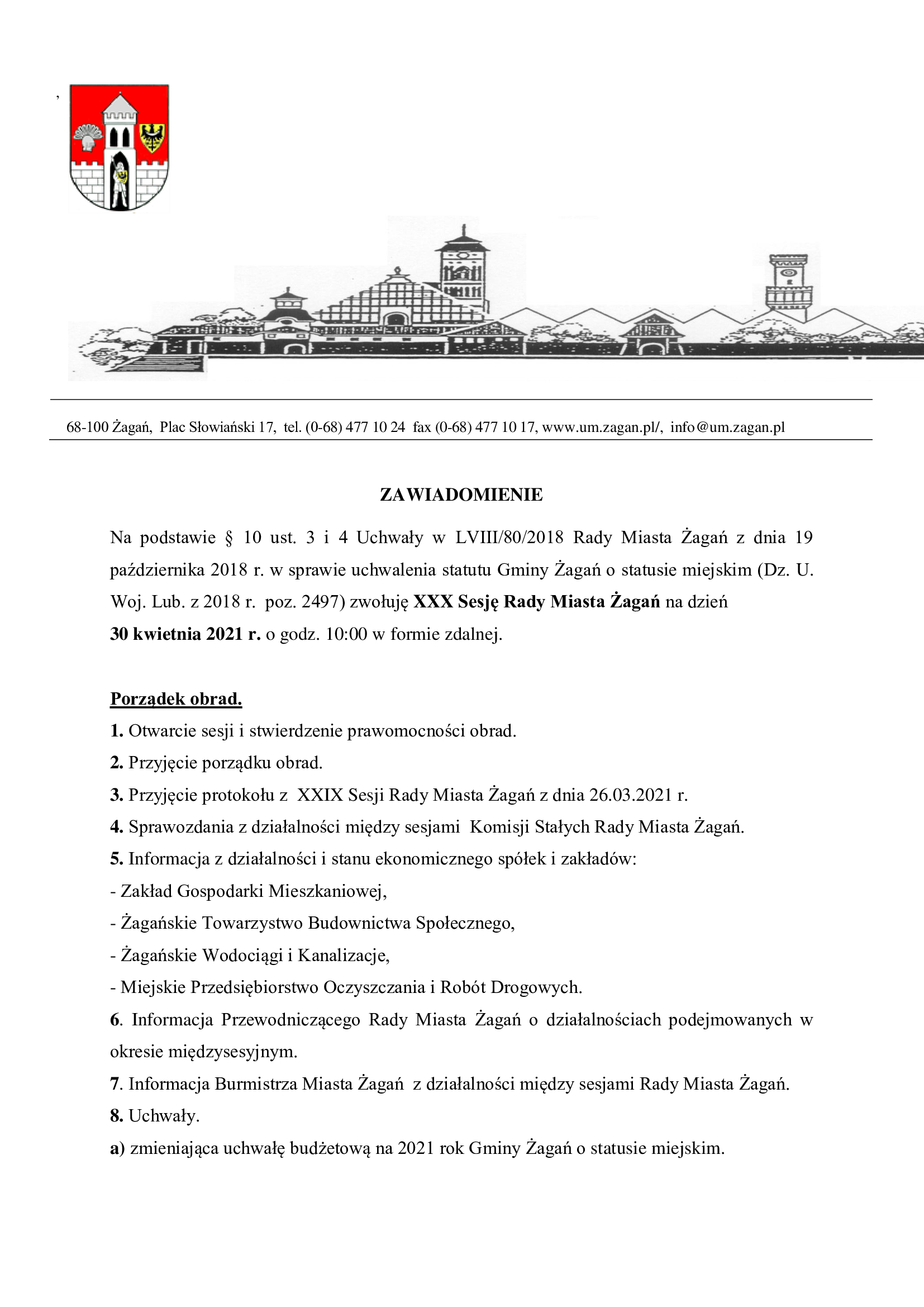 Informujemy, ze XXX Sesja Rady Miasta Żagań zwołana została na dzień 30 kwietnia 2021 roku o godz. 10:00 w formie zdalnej.