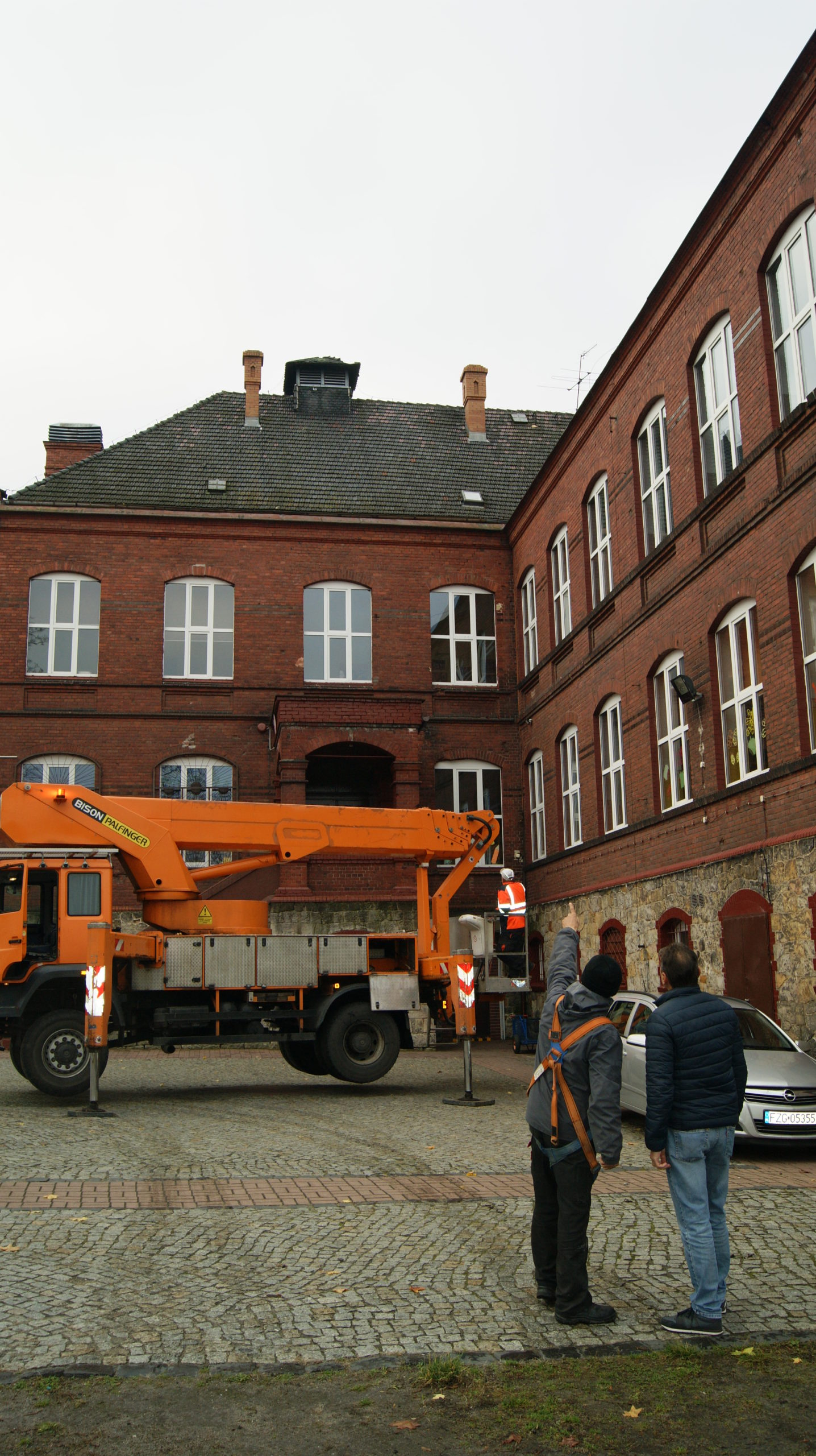 4 listopada 2021r. odbyło się spotkanie burmistrza Andrzeja Katarzyńca z wykonawcą remontu dachu w Publicznej Szkole Podstawowej nr 1 w Żaganiu, panem Sławomirem Turkiem. Ustalono, że usuwanie uszkodzeń dachu rozpocznie się w sobotę 6 listopada ze względu na dostępność wysięgnika o odpowiedniej długości. Wykonawca wstępnie przedstawił zakres niezbędnych do wykonania prac tj. wymianę i uzupełnienie uszkodzonych obróbek blacharskich, wymianę i uzupełnienie części rynien, usunięcie luźnych elementów dachu i gzymsów, uzupełnienie uszkodzonych elementów dachu. Przedstawił również kosztorys wykonania napraw na kwotę 62 000 złotych.