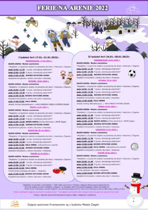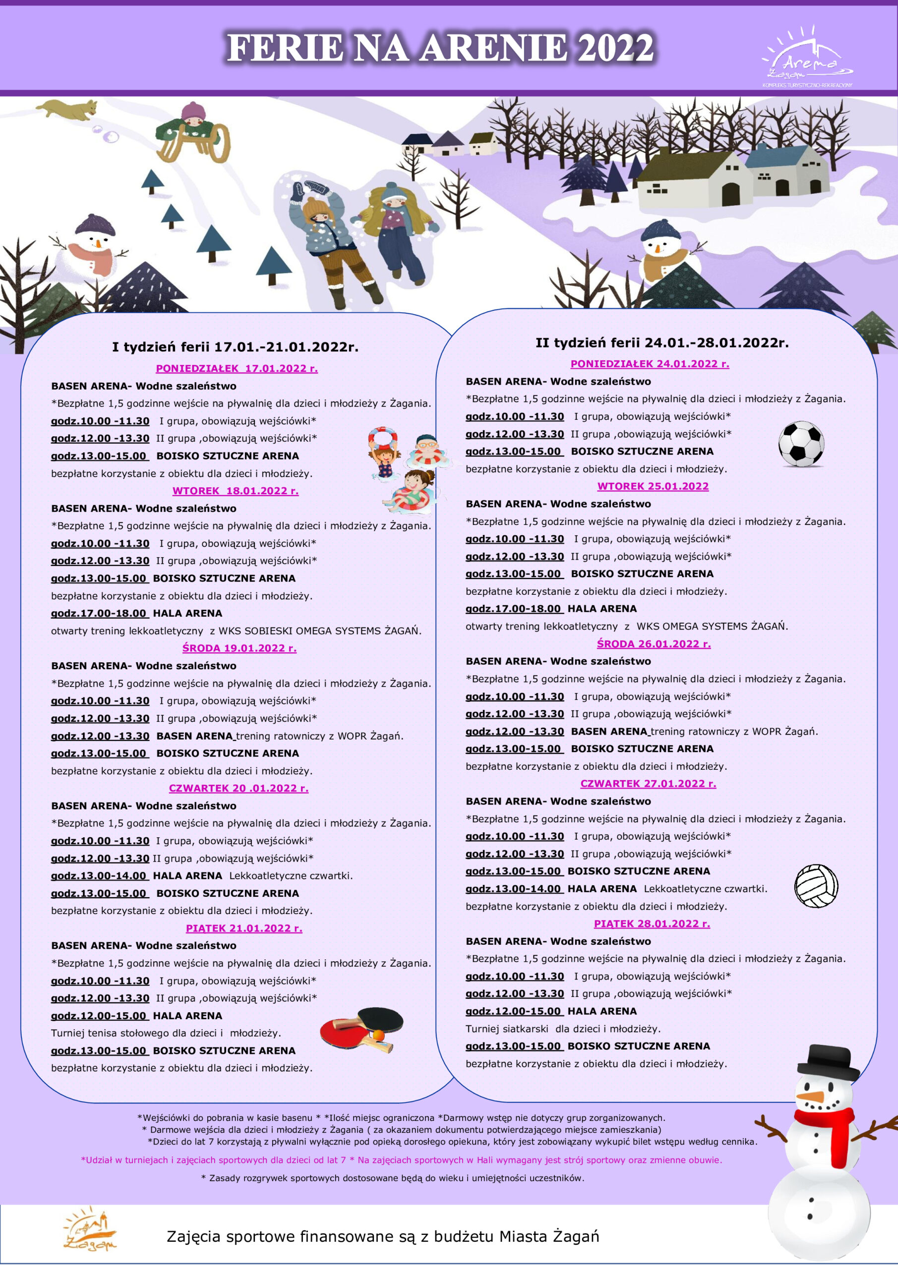 Do aktywności w okresie przerwy zimowej zachęca żagańska Arena. Od poniedziałku do piątku w godzinach od 10.00 do 11.30 oraz od 12.00 do 13.30 basen Arena czeka na dzieci i młodzież szkolną z Żagania z propozycją “Wodnego szaleństwa”, czyli bezpłatnego korzystania z pływalni. W godzinach od 13.00 do 15.00 kompleks otwiera dla najmłodszych boisko sztuczne. Od poniedziałku do piątku w godzinach od 11.00 do 14.00 otwieramy Orliki przy PSP nr 2 i PSP nr 3.