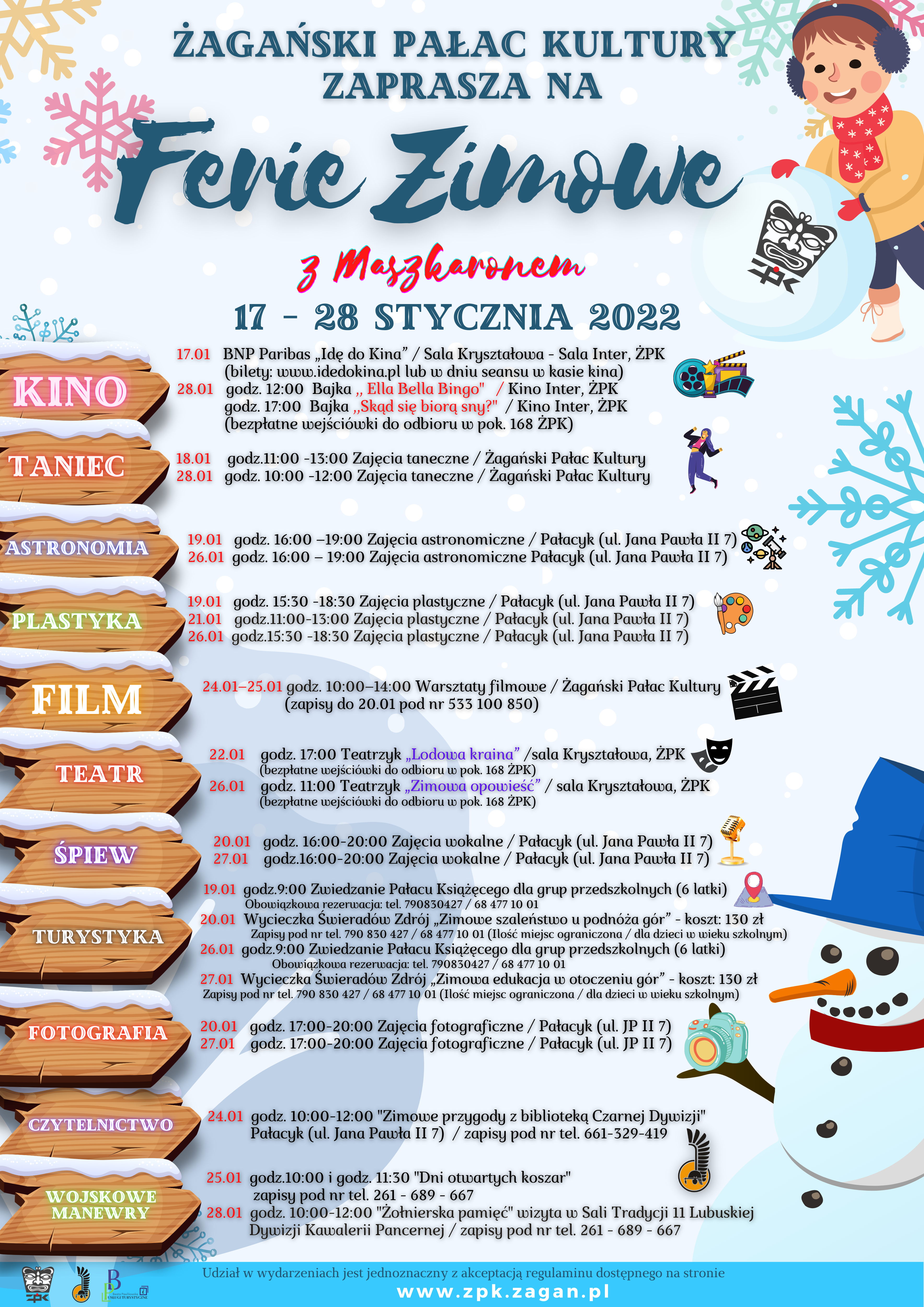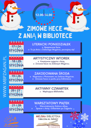 Od 17 do 28 stycznia zapraszamy dzieci na zajęcia przygotowane przez żagańskie placówki. W tym okresie zapraszamy na “Zimowe hece z Anią w bibliotece”, czyli na zajęcia przygotowane przez Miejską Bibliotekę Publiczną im. Papuszy w Żaganiu. Książnica zaprasza dzieci przez dwa tygodnie od poniedziałku do piątku w godzinach od 12.00 do 14.00 na spotkania z Anią Shirley, bohaterką książek Lucy Maud Montgomery. Żagański Pałac Kultury zaprasza na “Ferie z Maszkaronem”, czyli seanse filmowe, spektakle teatralne, wycieczki turystyczne oraz zajęcia artystyczne dla najmłodszych. Miłośników historii zachęcamy do odwiedzenia w trakcie ferii Muzeum Obozów Jenieckich. 18 i 25 stycznia dzieci mogą wziąć udział w zimowej wędrówce po muzeum i terenach obozowych z przewodnikiem. Zwiedzanie rozpocznie się o godz. 11:00. Wycieczka (w zależności od pogody) potrwa 2 godziny i zakończy się ogniskiem.