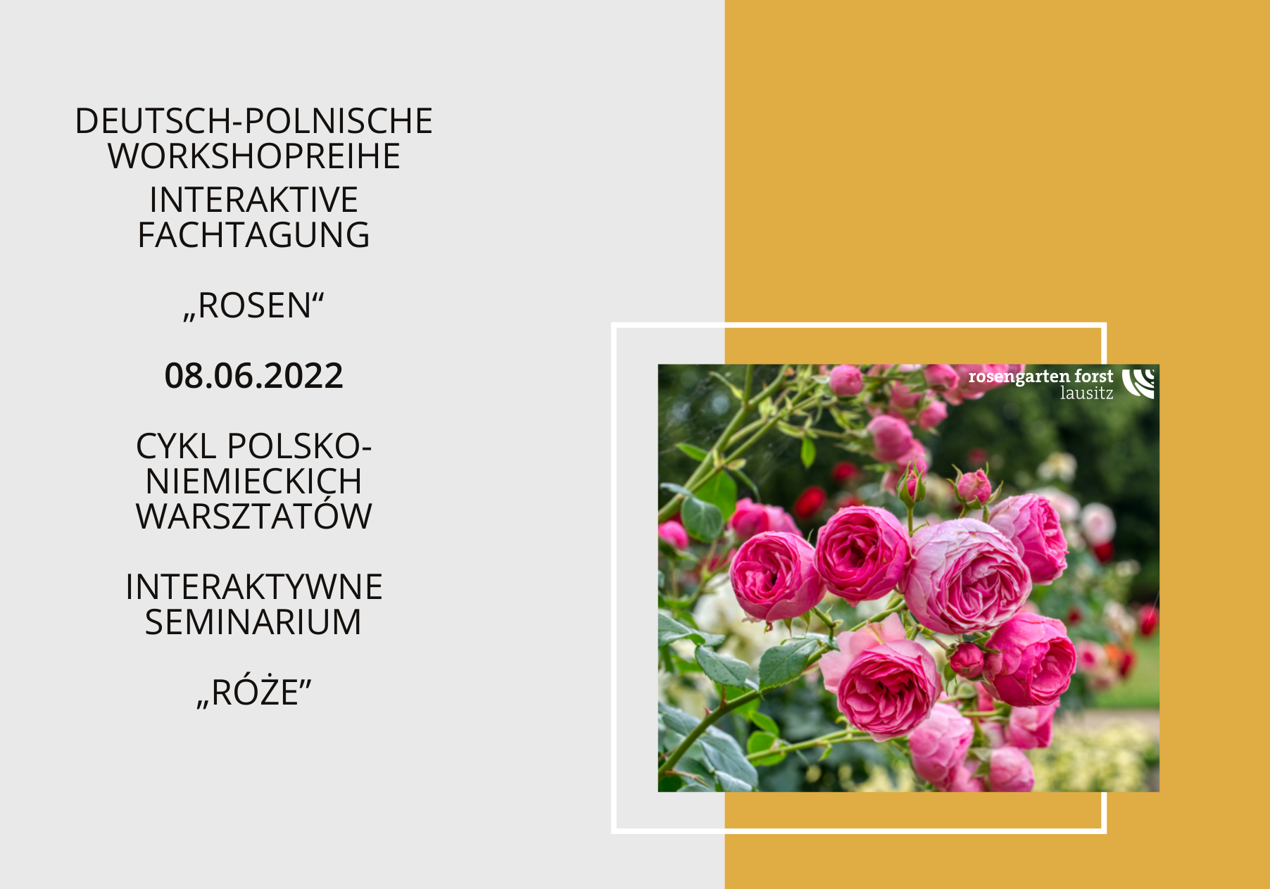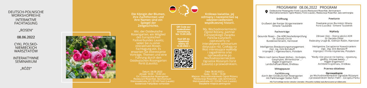 Wschodnioniemiecki Ogród Różany w Forst (Lausitz) zaprasza na polsko-niemieckie seminarium pt. “Róże”, które odbędzie się 8 czerwca br. o godz. 10:00 w restauracji Rosenflair (Ogród Różany, Wehrinselstraße 46, 03149 Forst).