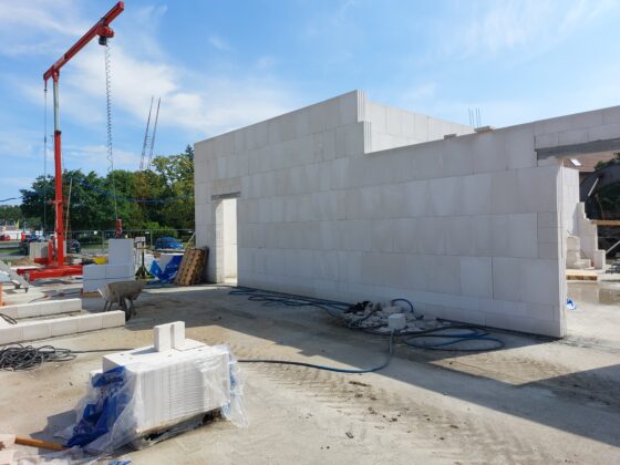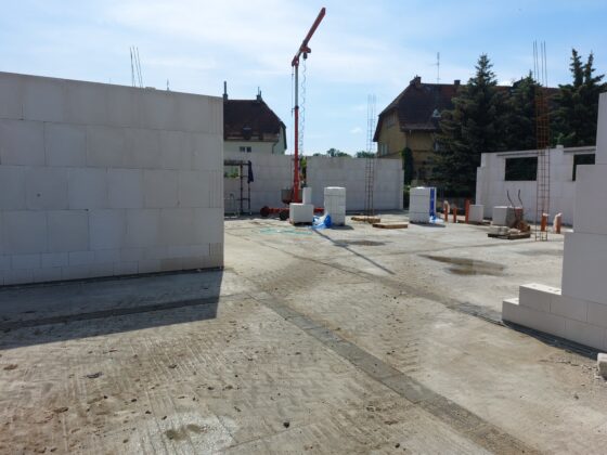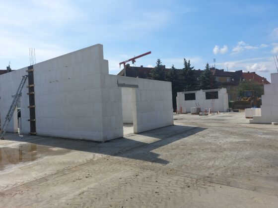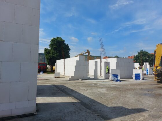 Jak postępuje budowa nowego żagańskiego przedszkola? Jak widać wykonywane są właśnie prace murowania ścian wraz ze zbrojeniem i szkalowaniem słupów żelbetowych. Wykonano już izolacje wokół budynku i zakończono prace przy instalacji podposadzkowej.
