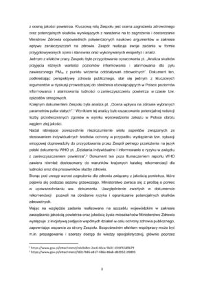 Z uwagi na rosnące znaczenie środowiskowych zagrożeń dla zdrowia, w celu zapewnienia czynnego udziału Ministerstwa Zdrowia w procesie decyzyjnym opartym o wiedzę naukową, 17 maja 2018 r. powołano Zespół Roboczy ds. Wpływu Zanieczyszczeń Powietrza na Zdrowie przy Radzie Zdrowia Publicznego (zwany dalej Zespołem). Zespół jest organem doradczym, który m.in. zajmuje się aspektami zdrowotnymi zanieczyszczeń powietrza oraz zapewnia wsparcie merytoryczne w kształtowaniu kierunków postępowania mających na celu ograniczenie negatywnego wpływu zanieczyszczeń powietrza na zdrowie populacji Polski.