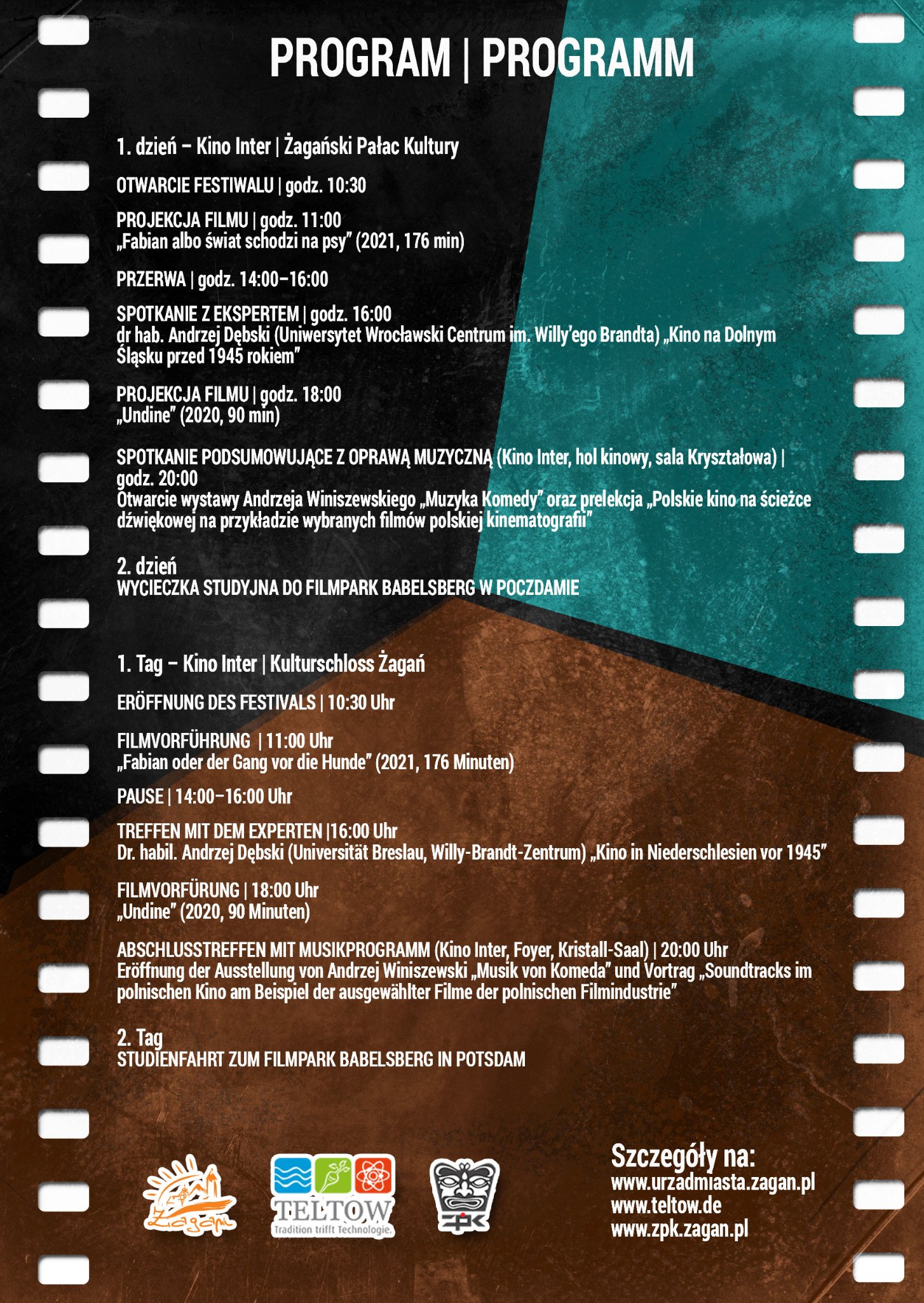 Zapraszamy do spędzenia całej soboty z “Filmowym latem pogranicza”. Nasz festiwal rozpoczniemy o 10.30 w sali Inter Żagańskiego Pałacu Kultury. Z przygotowanej oferty można wybrać to, co Państwa interesuje. Wziąć udział w wybranej prelekcji, projekcji lub wyjątkowym koncercie jazzowym.