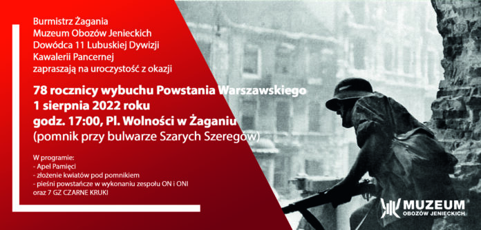W poniedziałek 1 sierpnia mija 78 lat od wybuchu Powstania Warszawskiego. Dziś o godzinie 17.00 zapraszamy mieszkańców Żagania na plac Wolności (pomnik przy bulwarze Szarych Szeregów), gdzie odbędą się uroczystości upamiętniające to wydarzenie. W programie apel pamięci, złożenie kwiatów oraz pieśni powstańcze w wykonaniu zespołu ON i ONI oraz 7 GZ Czarne Kruku.