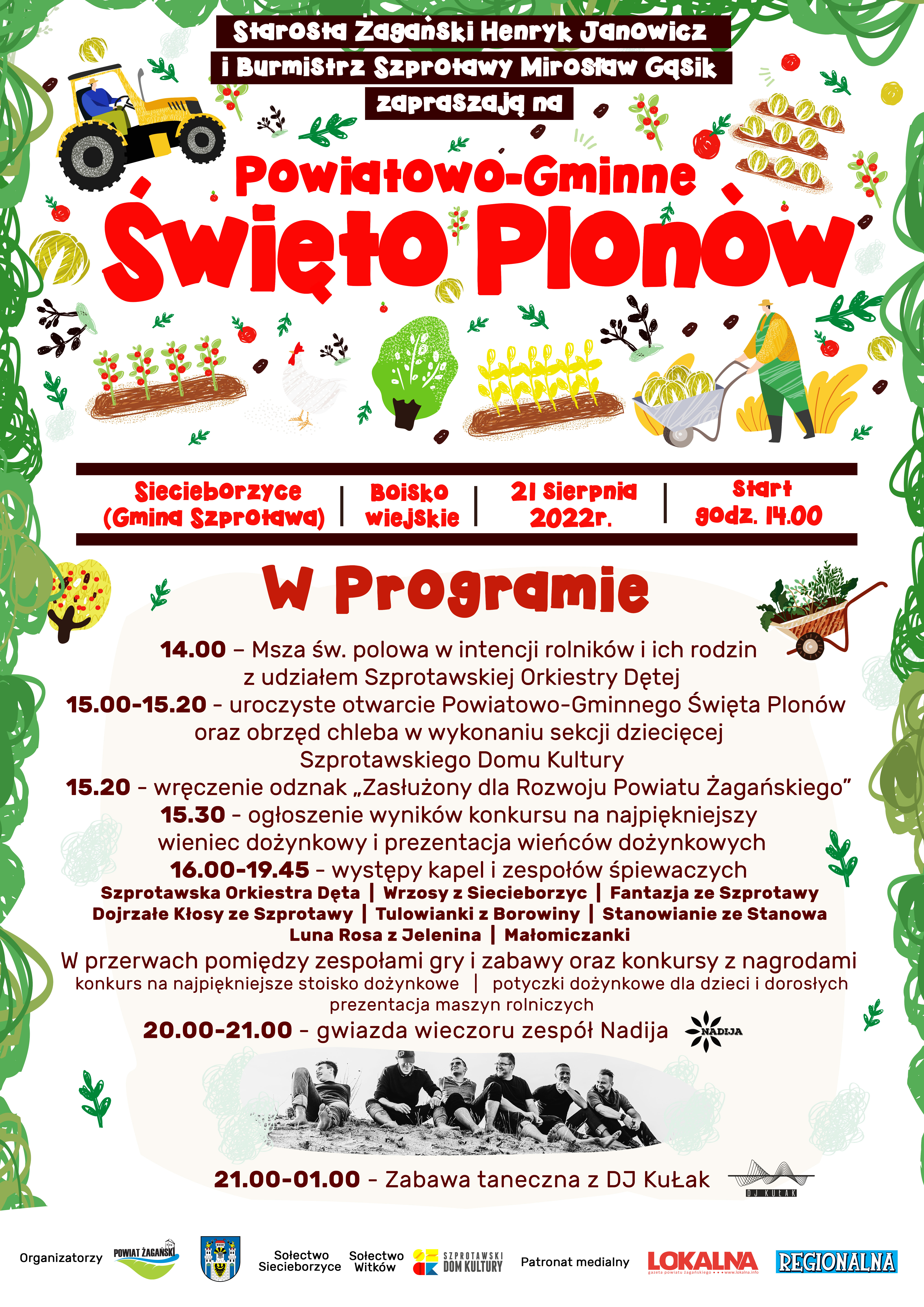 Zapraszamy wszystkich mieszkańców do wzięcia udziału w wydarzeniu oraz do wspólnej zabawy. Czekają na Państwa konkursy z nagrodami, gry oraz zabawa taneczna przy muzyce. Gwiazdą wieczoru jest zespół Nadija, a tuż po niej na scenie pojawi się DJ KuŁak.