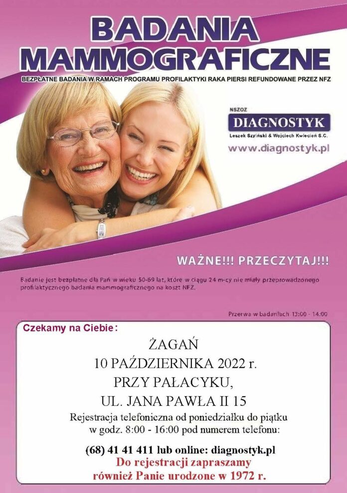 10 października na parkingu przy pałacyku na ul. Jana Pawła II 15 przeprowadzane będą bezpłatne badania mammograficzne dla kobiet w wieku od 50 do 69 lat, które w ciągu ostatnich dwóch lat nie miały wykonywanych tego typu badań. Z bezpłatnych badań mogą skorzystać Panie urodzone w latach 1967-1972.