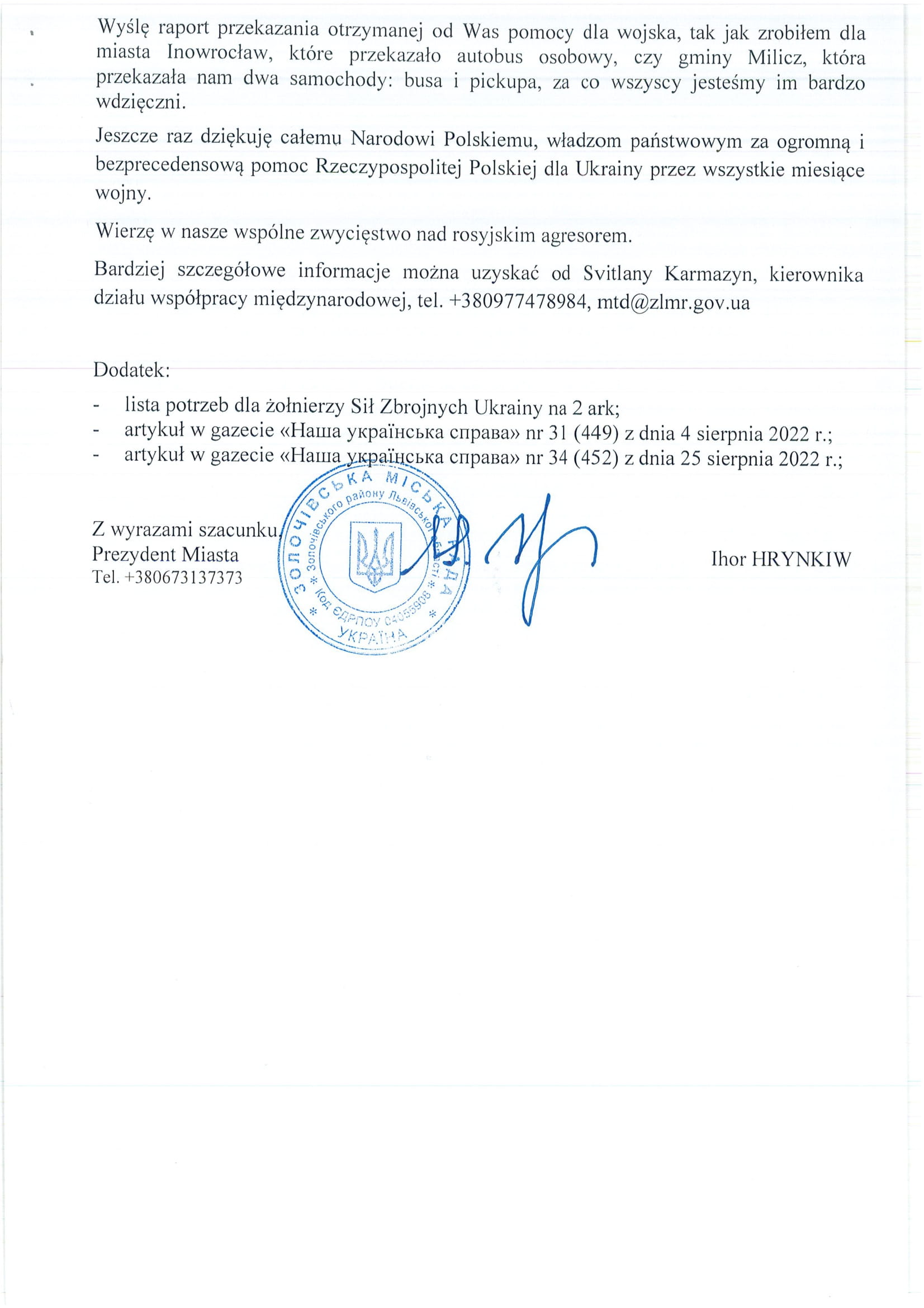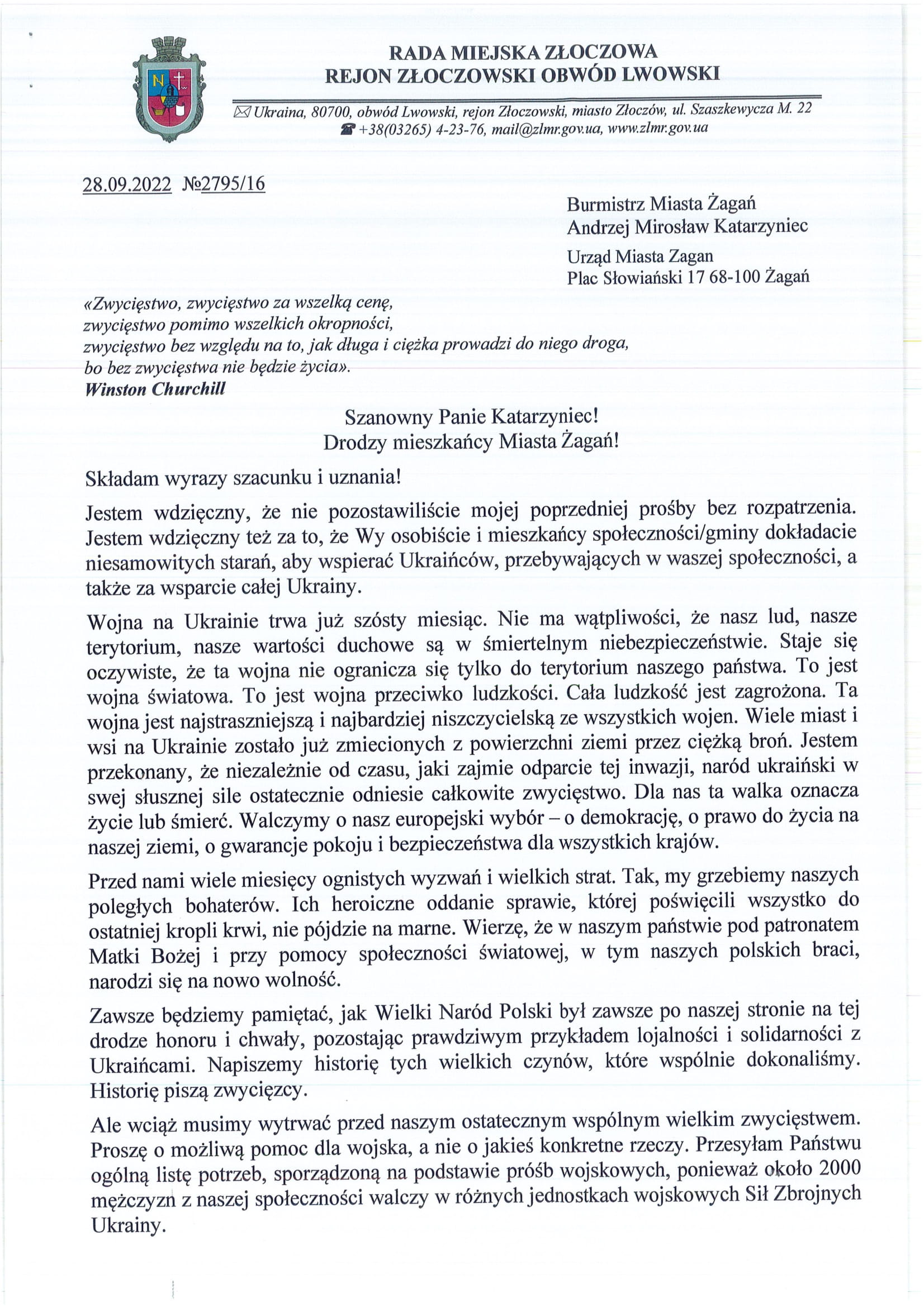 Burmistrz Andrzej Katarzyniec odebrał dziś listowne podziękowania za pomoc, jakiej mieszkańcy Żagania udzielili walczącej Ukrainie. Prezydent Złoczowa w Obwodzie Lwowskim Ihor Hrynkiw wyraził wdzięczność za reakcję na wcześniej przesłaną prośbę i przekazane dary. Pomoc ta pomaga walczyć Ukraińcom o demokrację, o prawo do życia na własnej ziemi, o gwarancje pokoju i bezpieczeństwa dla wszystkich krajów.